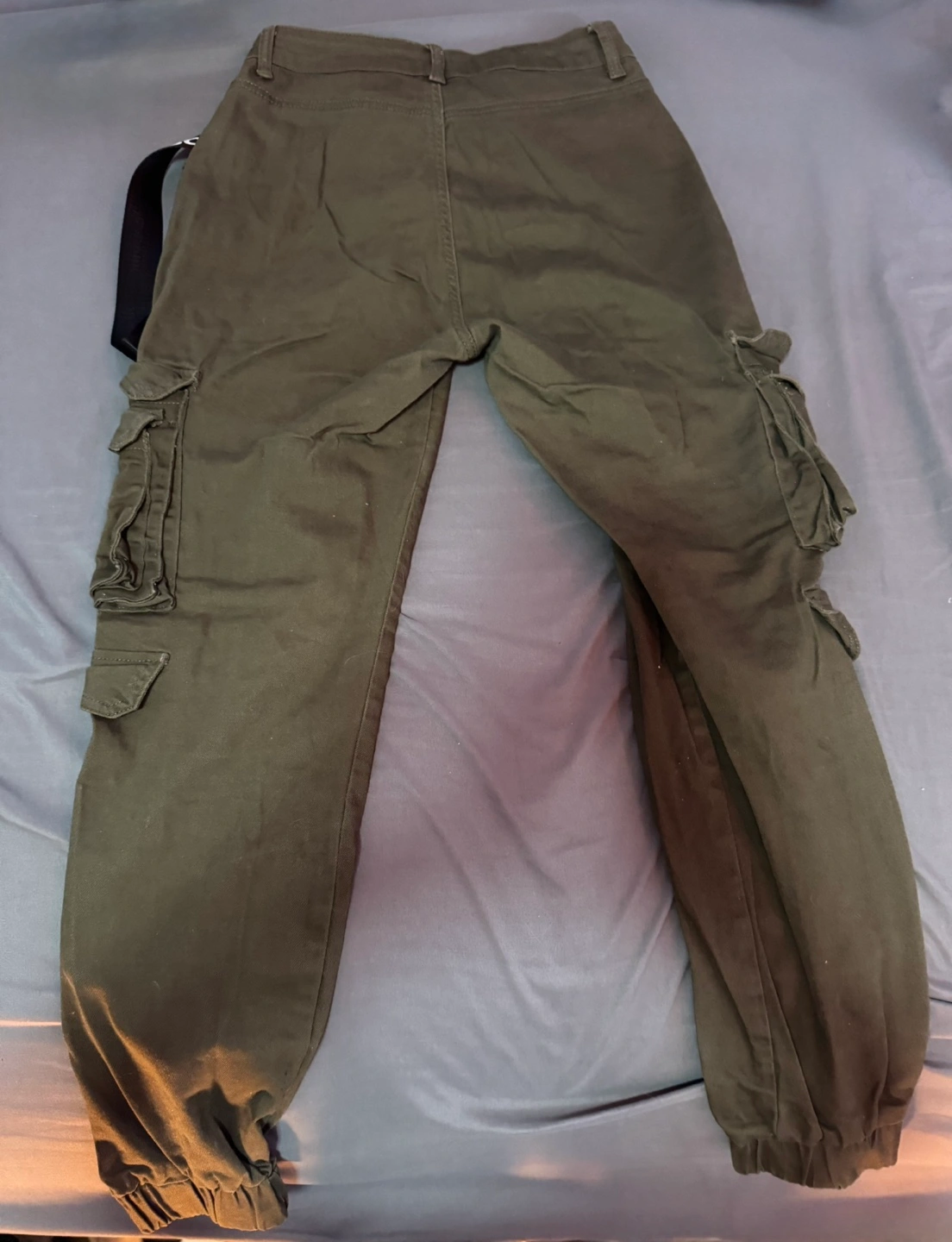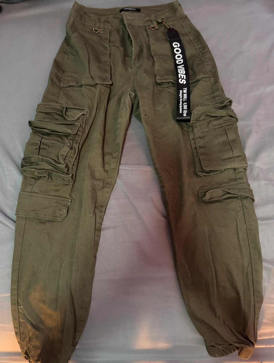 Women's olive green cargo pants. Multiple pockets. Drawstring at the ankles. Good condition.