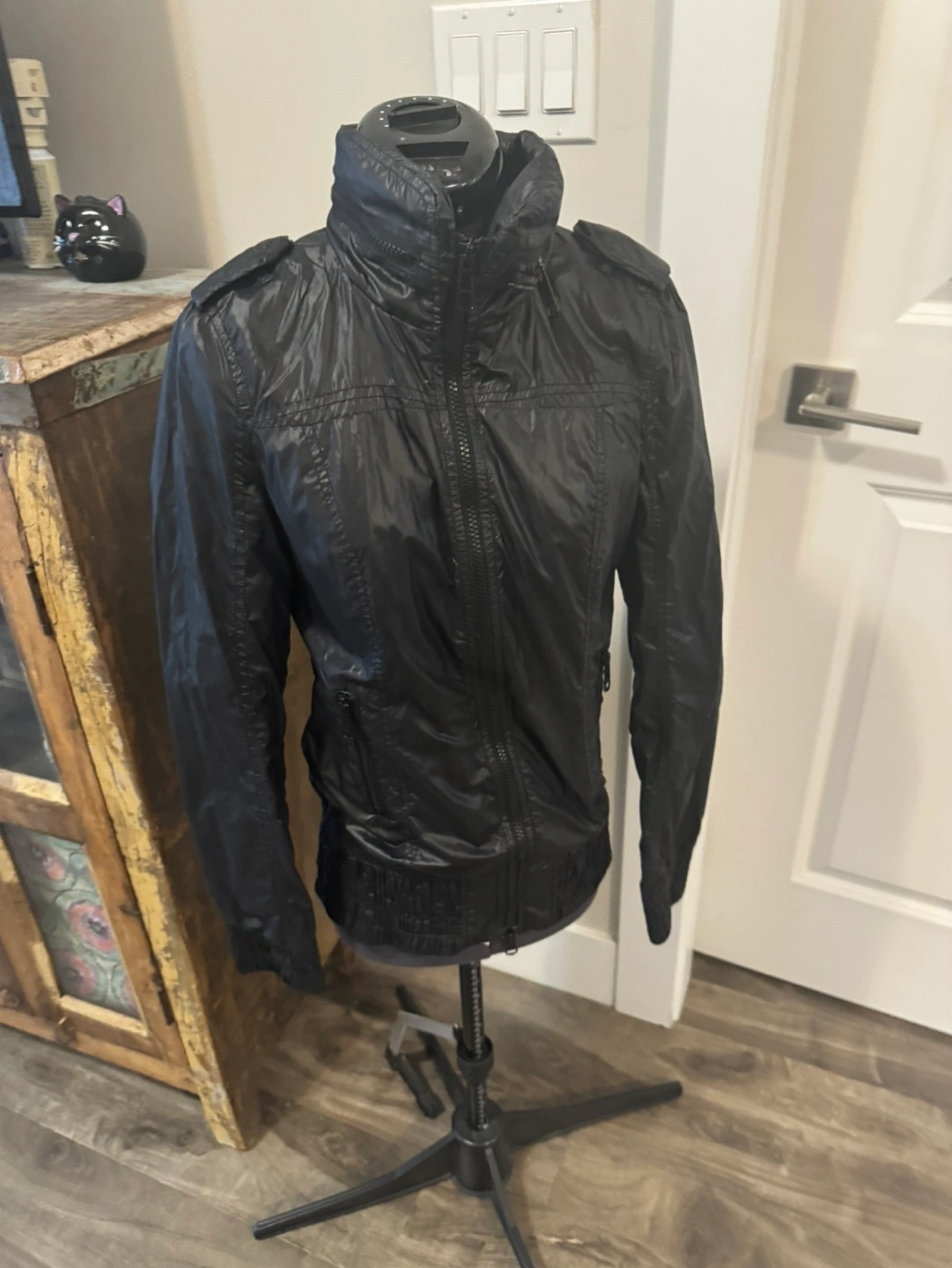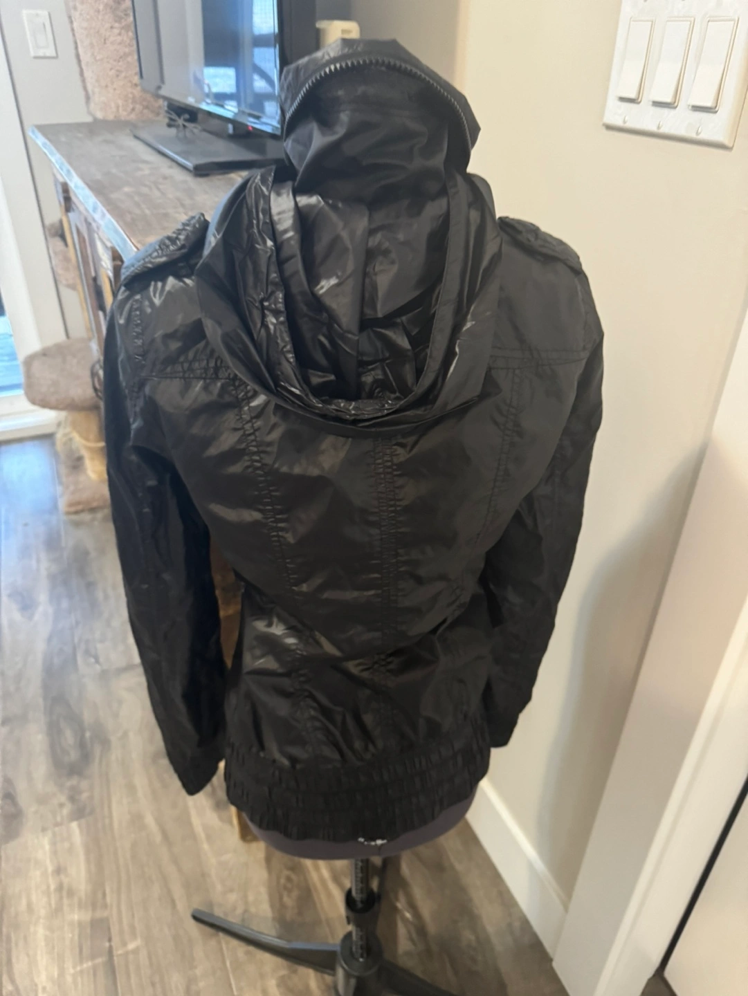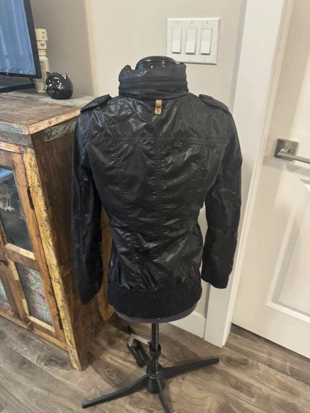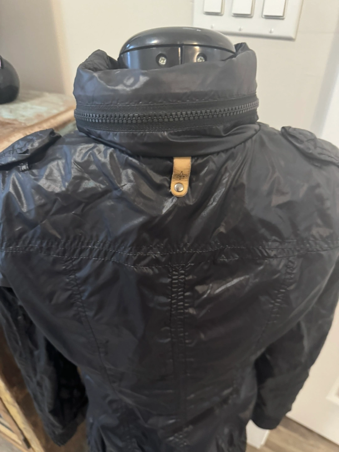 Mackage packable shell - est xs (as is) Folds into pouch. Hood zips into collar. Light weight. 2 small holes ๐ณ๏ธ by inner collar not visible outside. Faded fabric / size tag. Medallion that turns into strap no longer locks Pit to pit 16โ Length 25โ Sleeves 24โ