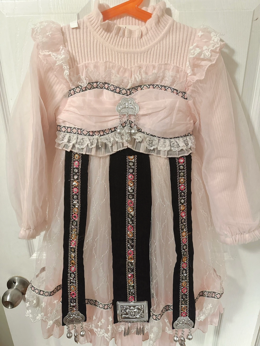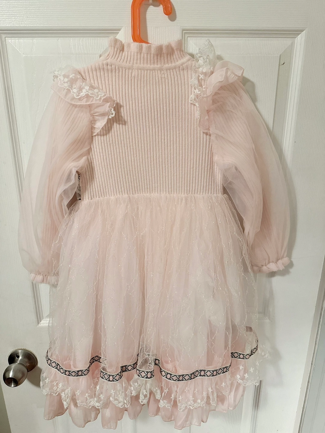 Unique vintage dress. Features a pink knit bodice, sheer overlay, and intricate detailing. Lace accents and decorative embellishments. Long sleeves. Size 4-5t