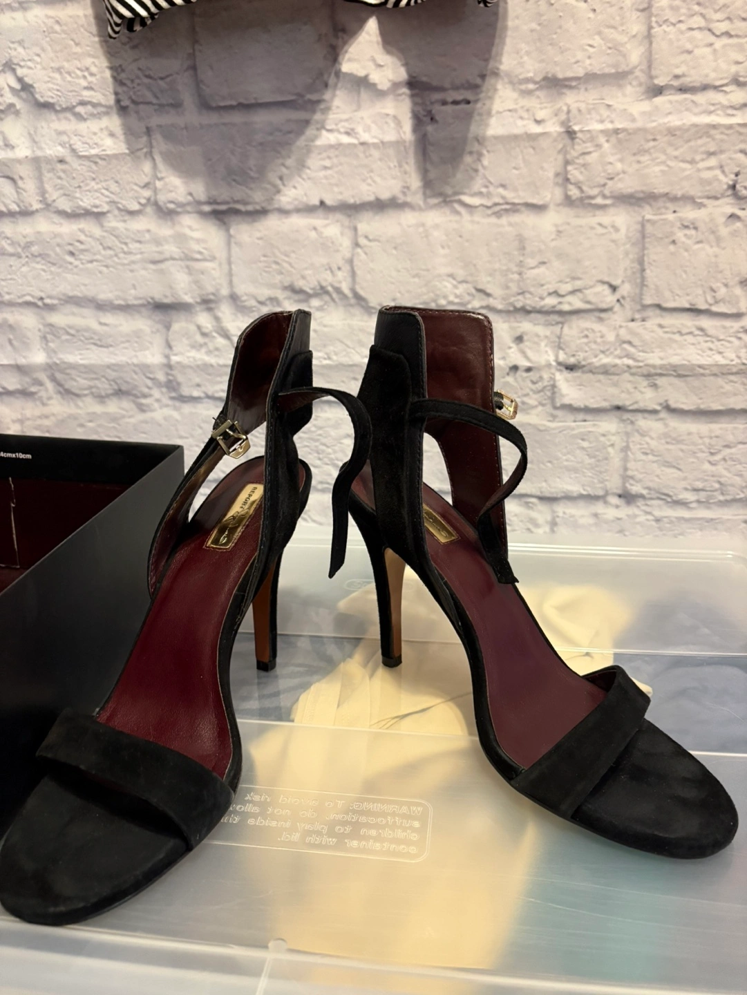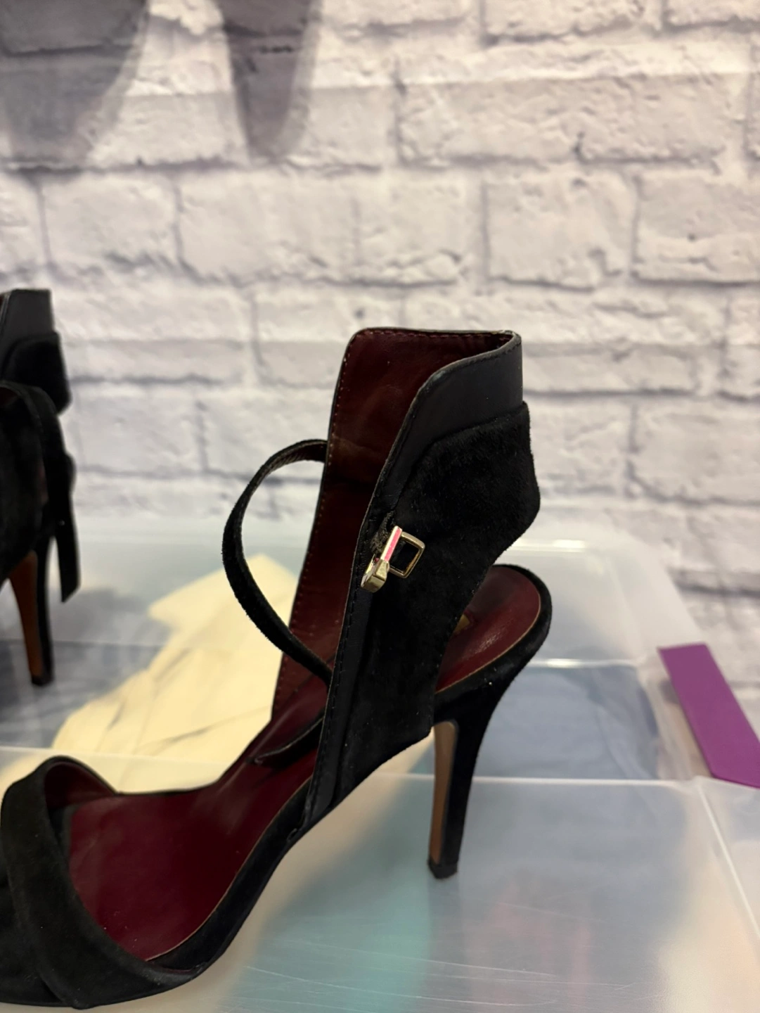 Black suede and leather evening sandals. Size 9. High heels. Ankle strap closure. Some light signs of wear. Pick up only.