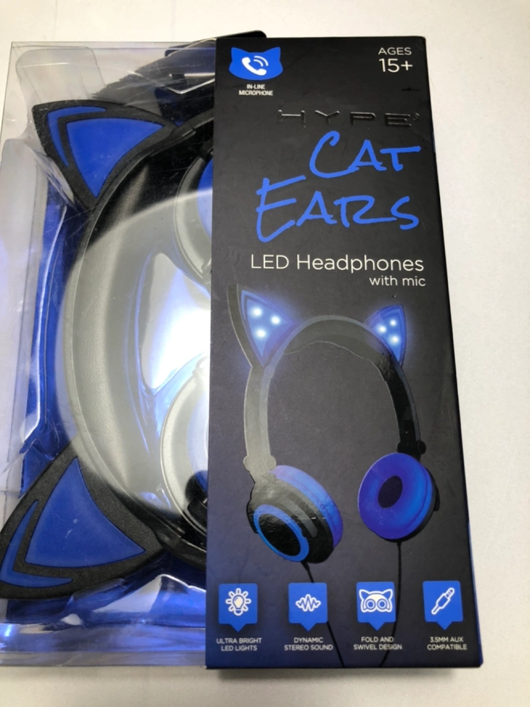 Brand new in box, LED headphones. Features cat ears, ultra-bright LED lights, dynamic stereo sound. Fold and swivel design. 3.5mm AUX compatible. In-line microphone.