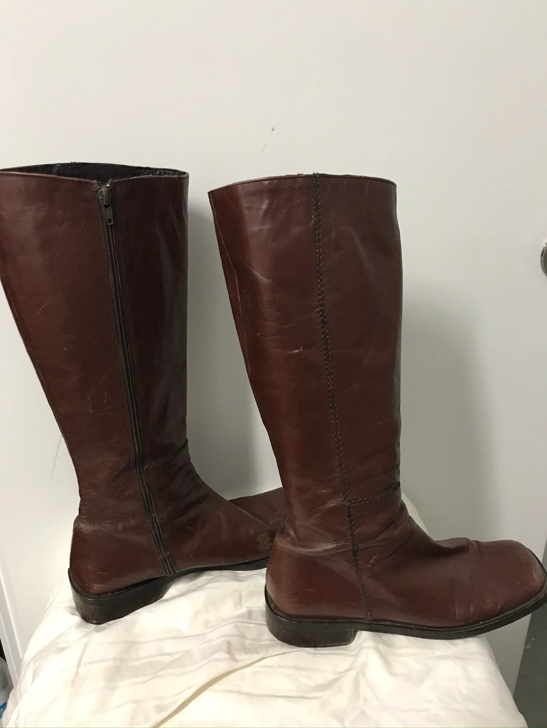 Caramel Brown, butter soft leather, square-toed, tall boots. Zip closure. Made in Italy. Visible wear in the toes and a few kitty cat scratches (currently pet free home). These are vintage and at that time, a 41 was women’s size 10. Smoke free home. Cash only please.