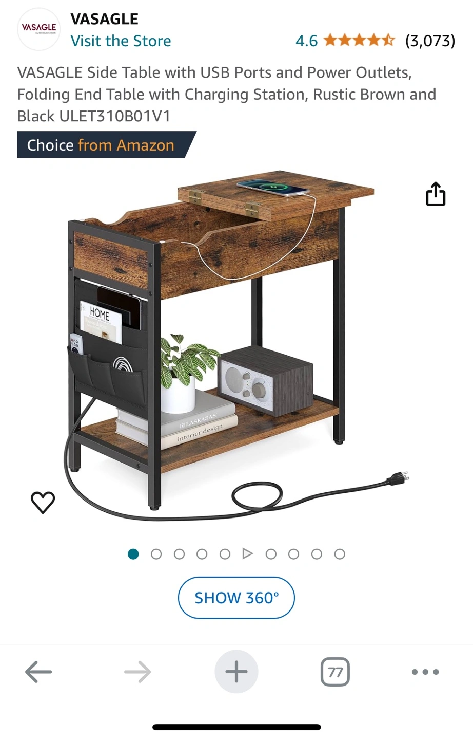 Folding end table with charging station. Rustic brown and black finish. Features a lift-top with storage and a lower shelf. Includes built-in power outlets and USB ports.