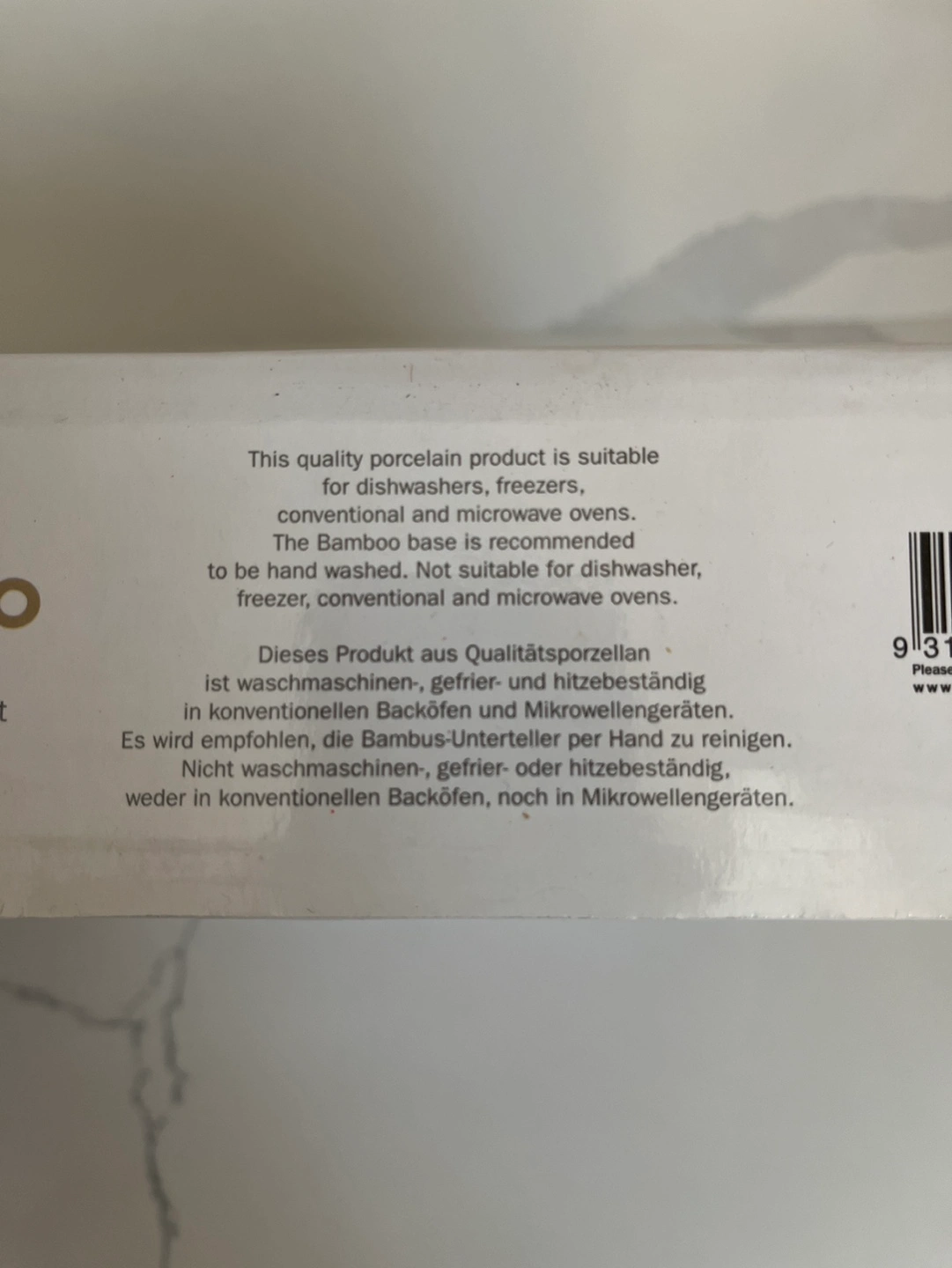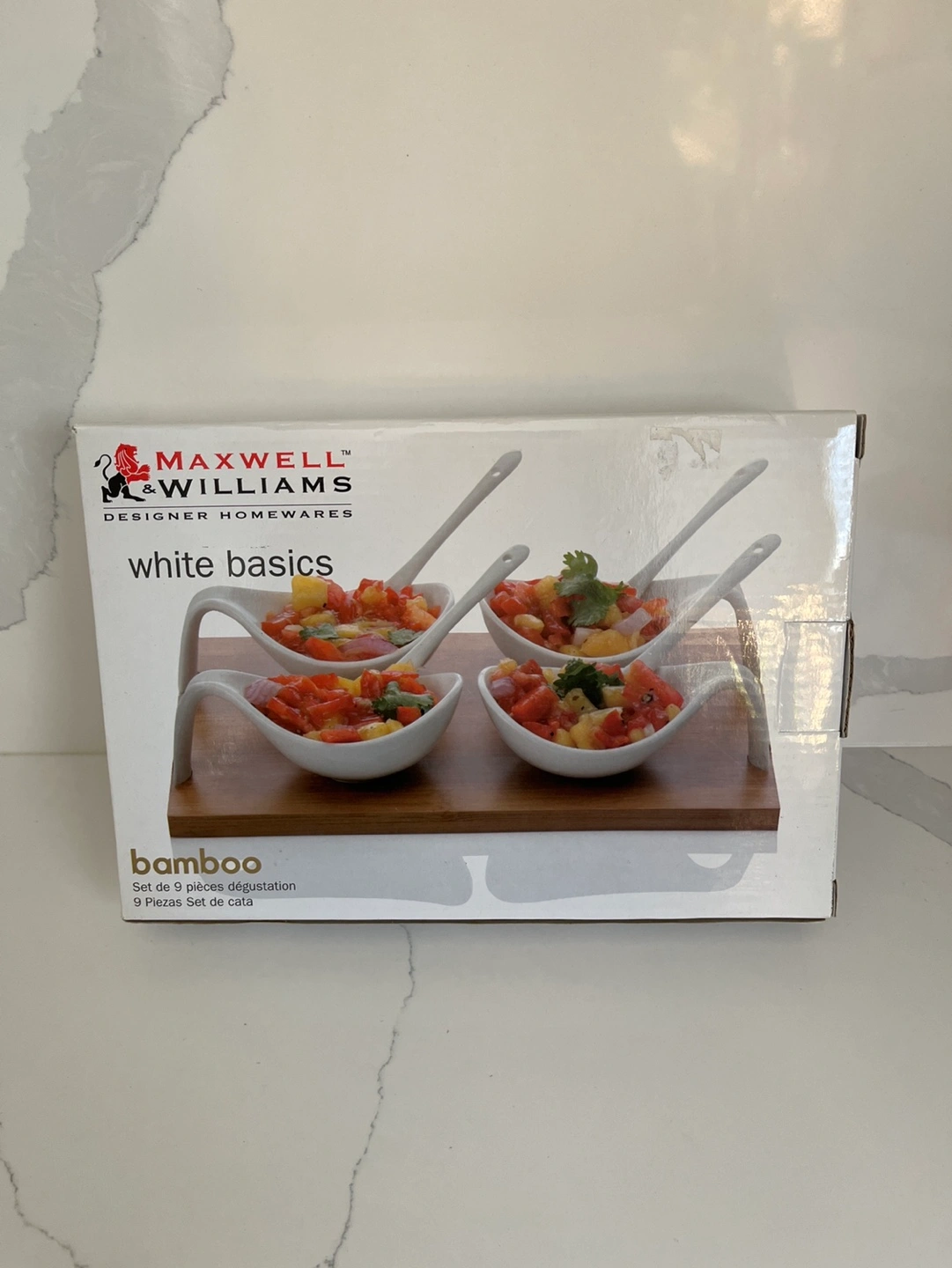 Brand new in box. Nine-piece porcelain tasting set. Includes four small bowls, four spoons, and a bamboo serving tray. Dishwasher and microwave safe. Great for appetizers or desserts. Retails for $27.95 + tax.