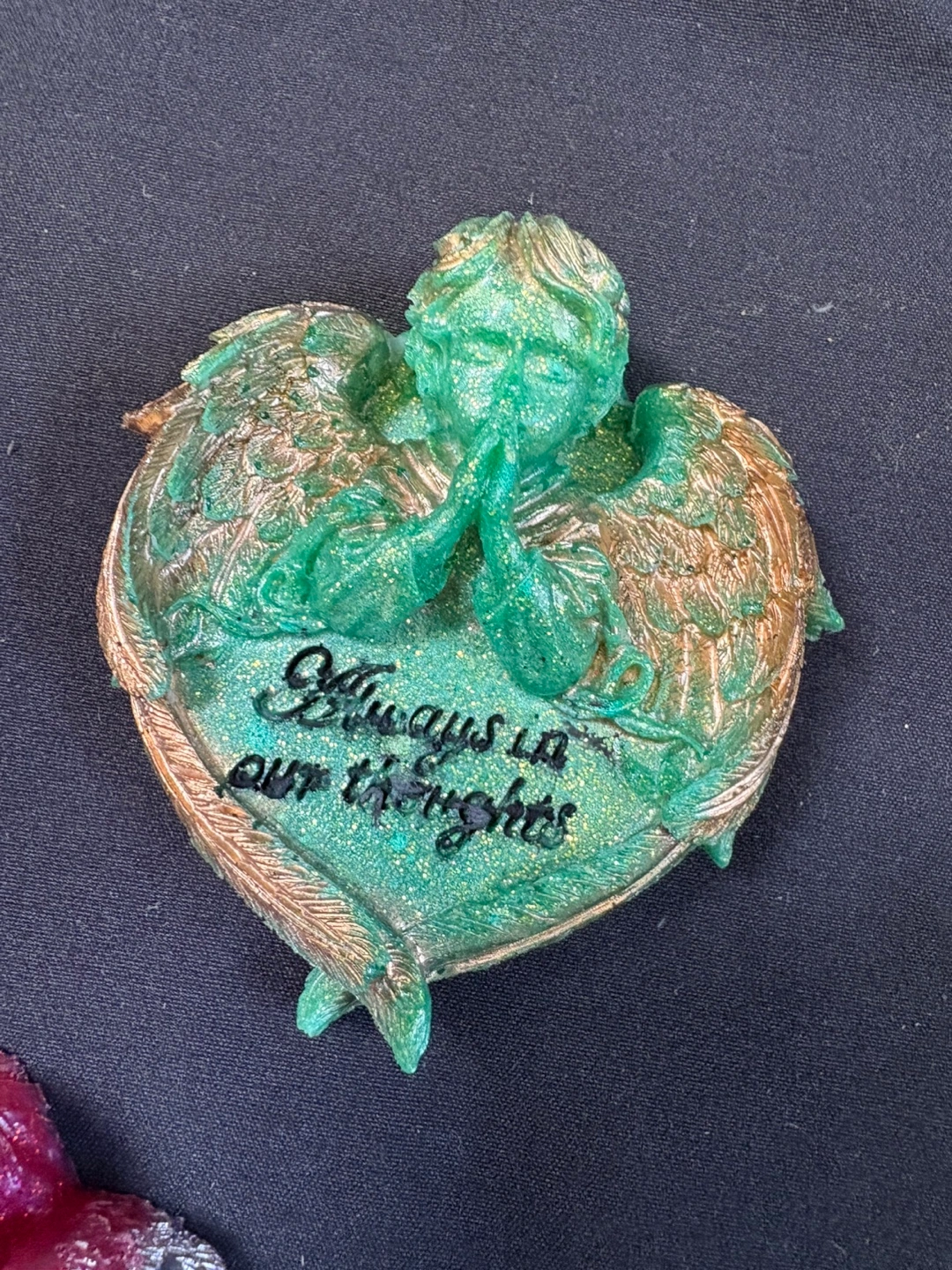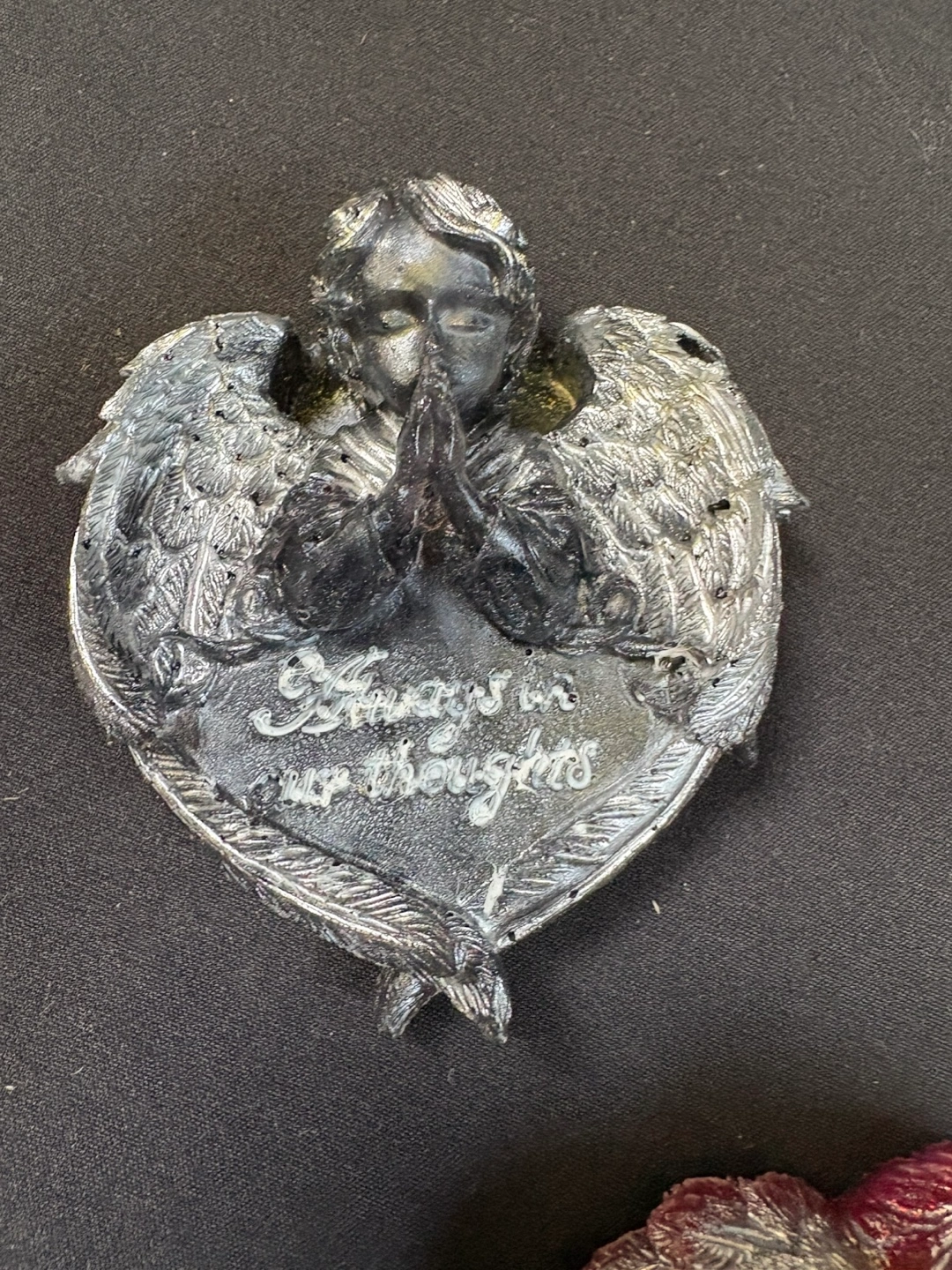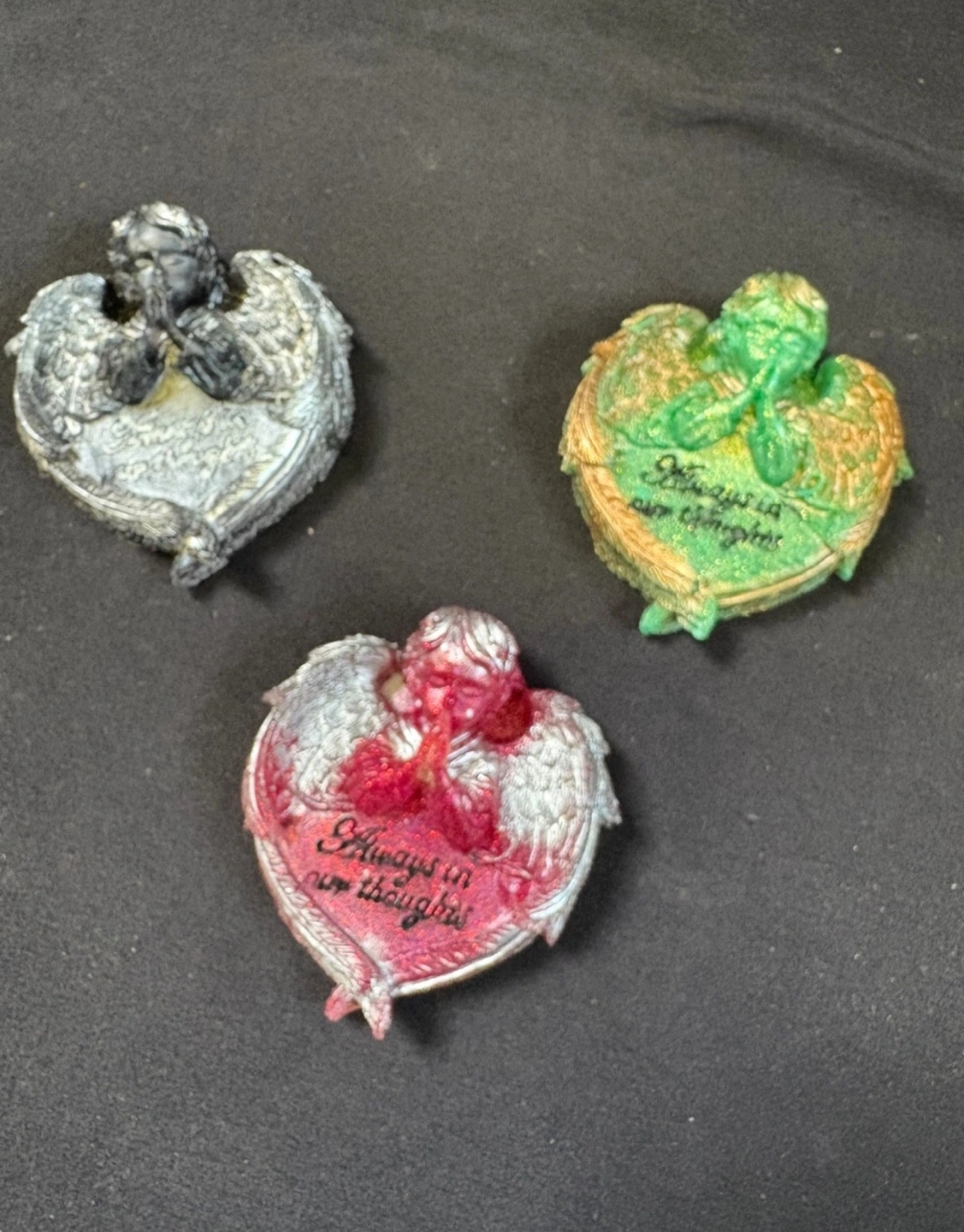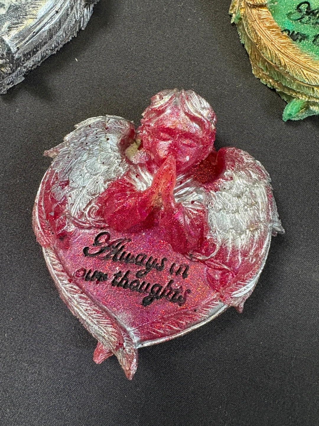 New 3 resin angel figurines. Each features an angel with wings in a heart-shaped frame. Text reads, "Always in our thoughts". Colours include red, green, and silver. $1 each Pick up Victoria Park and O’Connor area