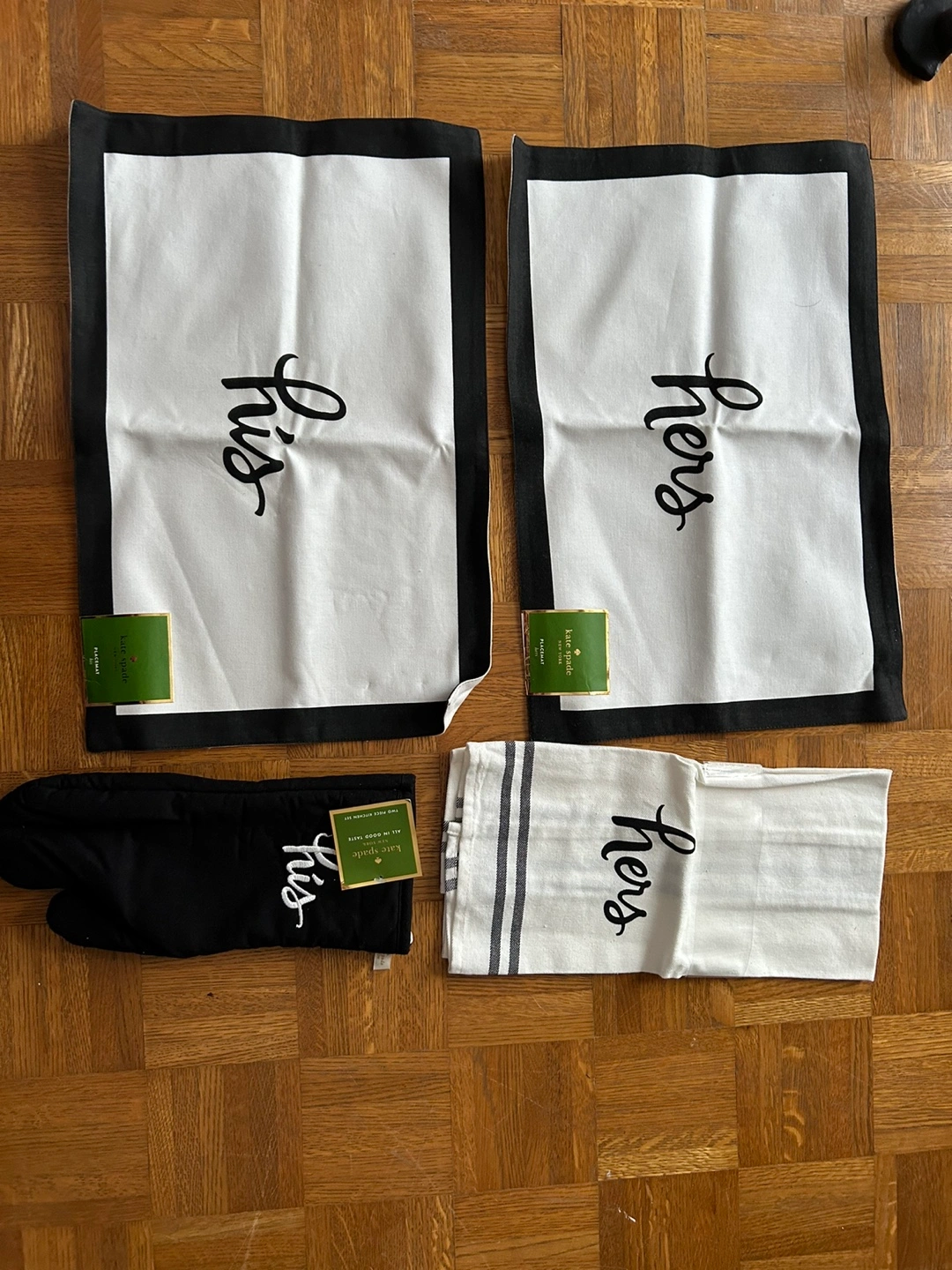 Brand new never used his and hers Kate Spade kitchen set Good for a gift.
