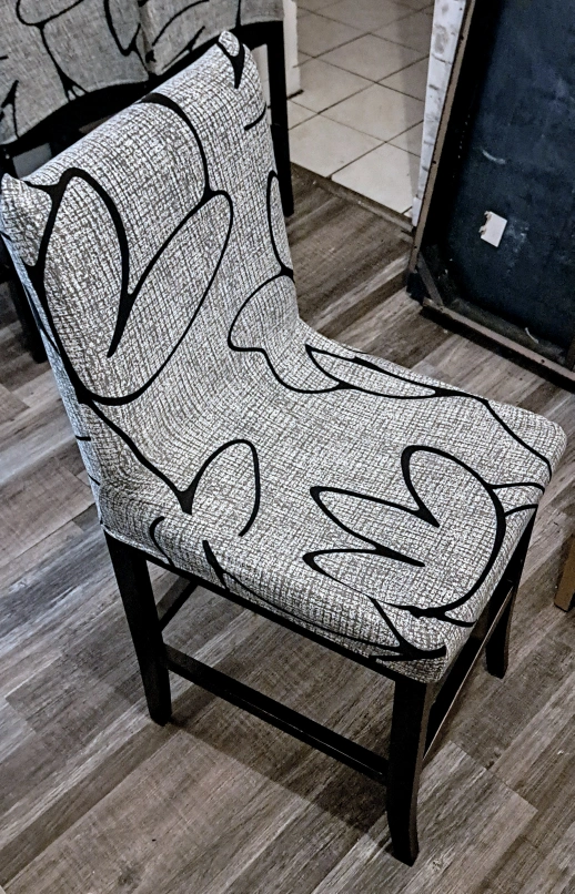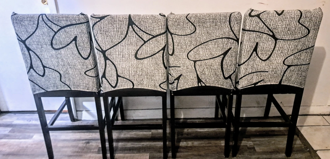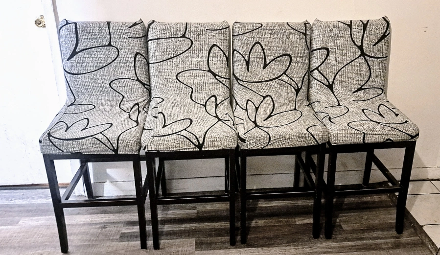 Four bar stools. Dark brown legs. Grey and black patterned fabric Covers. Stylish and modern design. Suitable for kitchen island or bar. Note, the leather seats are worn underneath so the reason for the covers. If interested, send me a message. $80 for all 4 OBO. -David