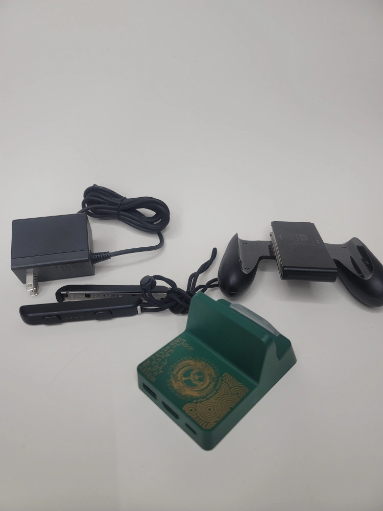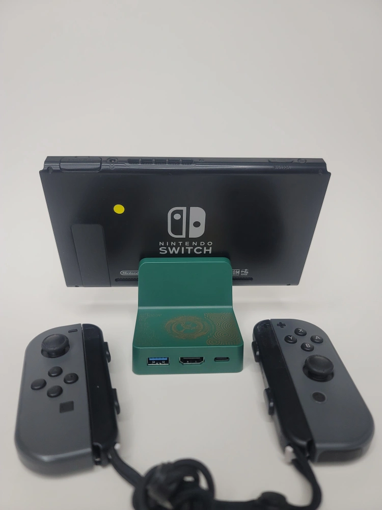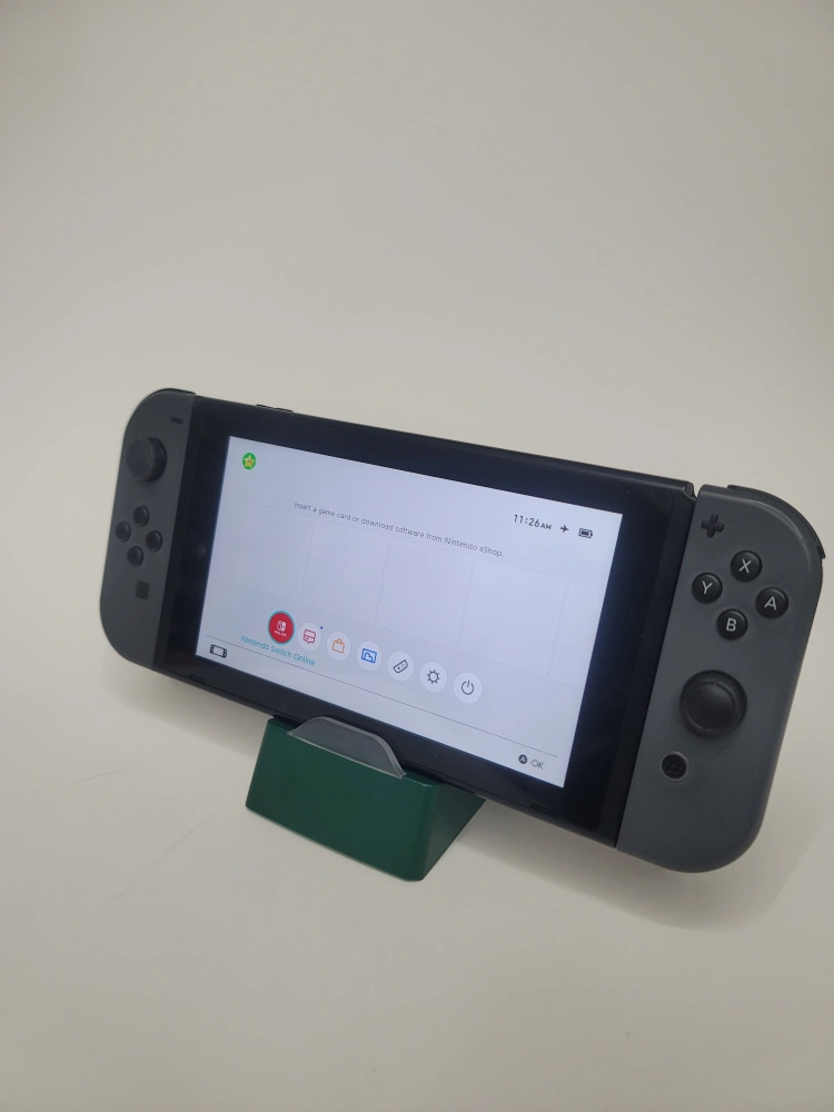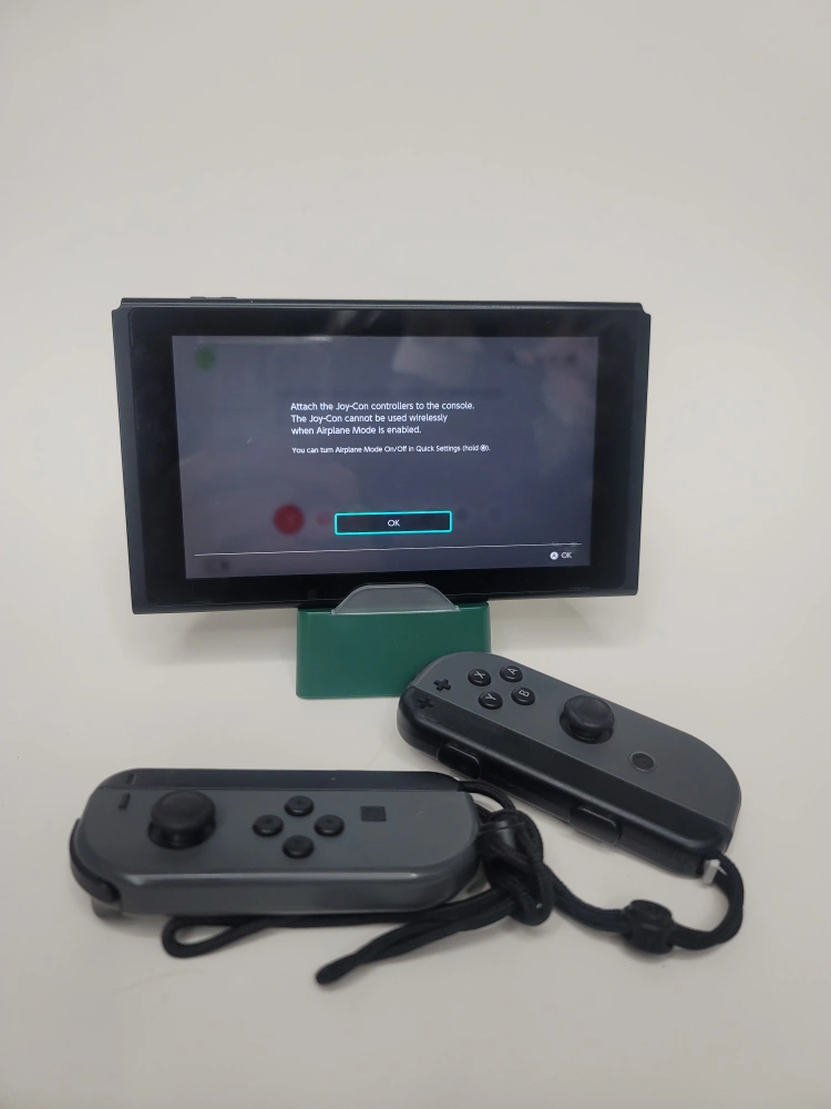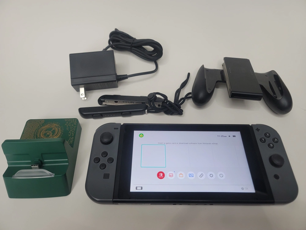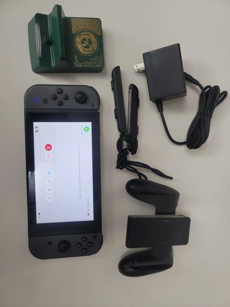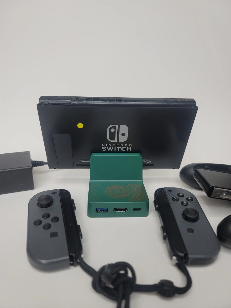 Nintendo Switch console, grey Joy-Cons, charging cradle, AC adapter, and dock included. It doesn't come with games. Great condition, ready to play.
