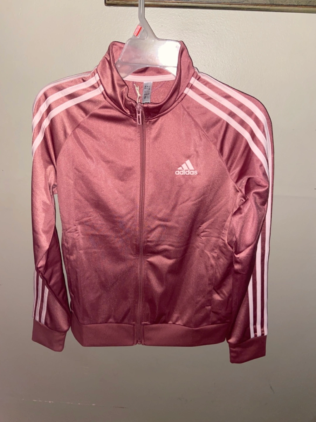 BNWT Adidas Women’s Essentials 3-stripes track top size Medium Fit like a small Note- it fits like a small. It’s labeled as size medium Description * Slim fit * Full zip closure * Long sleeve * adidas 3-stripes detail at sleeve * Ribbed hem and cuffs * Product Material: 56% Cotton / 40% (recycled) Polyester / 4% Elastane * Has side pockets Colour- blush pink ish/ purple ish Cash Payment only No Refunds / Exchange No try ons, No trading No holds. All purchases are Finally Sale From a Smoke Free home First come, First Serve Fast pick up Price-$25 Pick up- at TTC Station- Coxwell subway station Located In East York, Toronto Drop off available- Only Within East York area for Extra fee cost. Depends on the distance. Just ask for my info