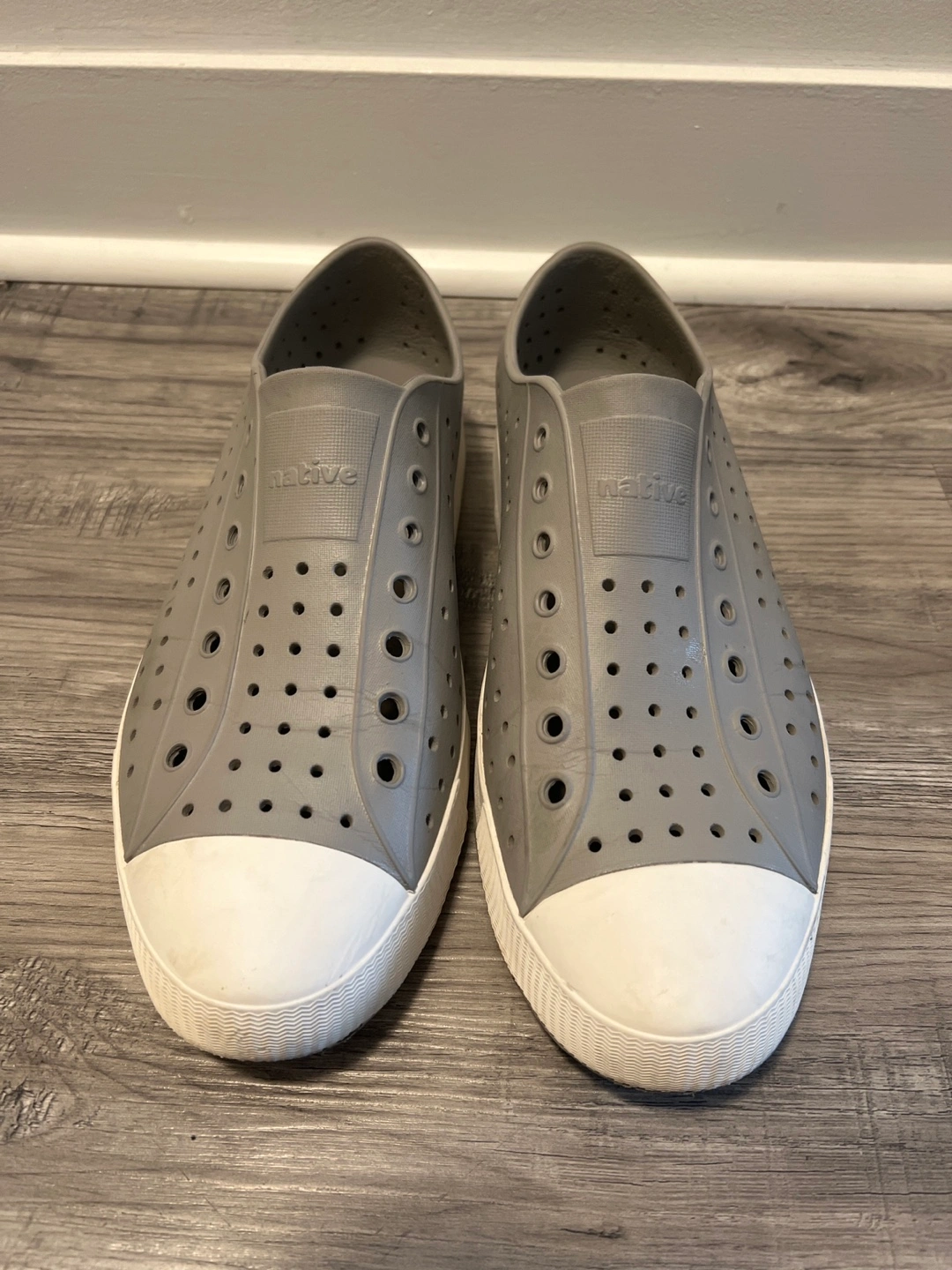 Pair of grey slip-on shoes. Lightweight and breathable. Great for casual wear. Size 13