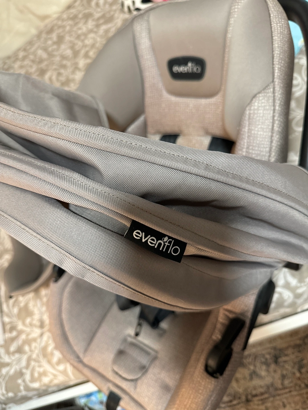 Infant car seat, grey fabric. Includes canopy. Excellent condition. Please see images for details. Fixed price.Must go asap.