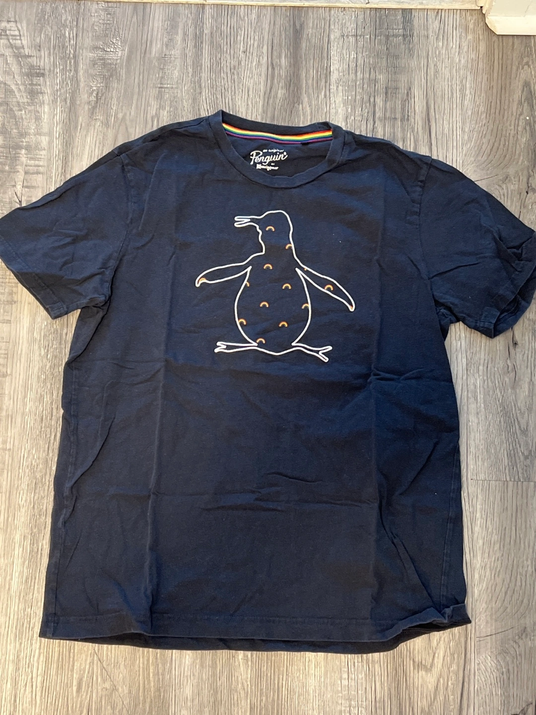 Men's short sleeve t-shirt. Black cotton. Features a graphic of a penguin with rainbows. Great for casual wear.size large