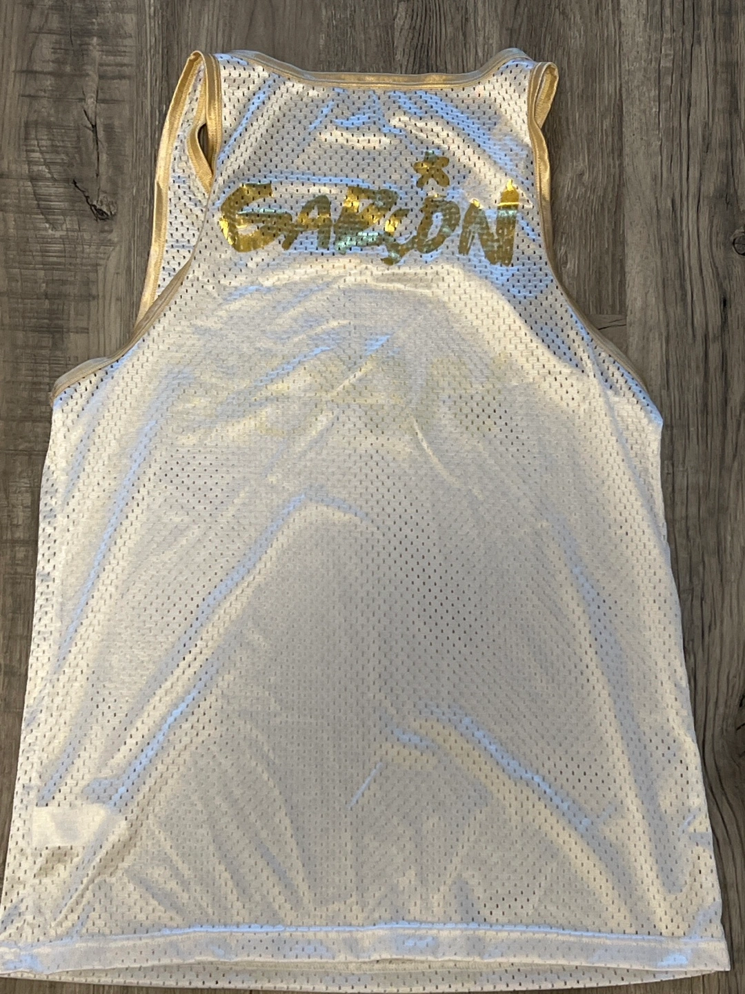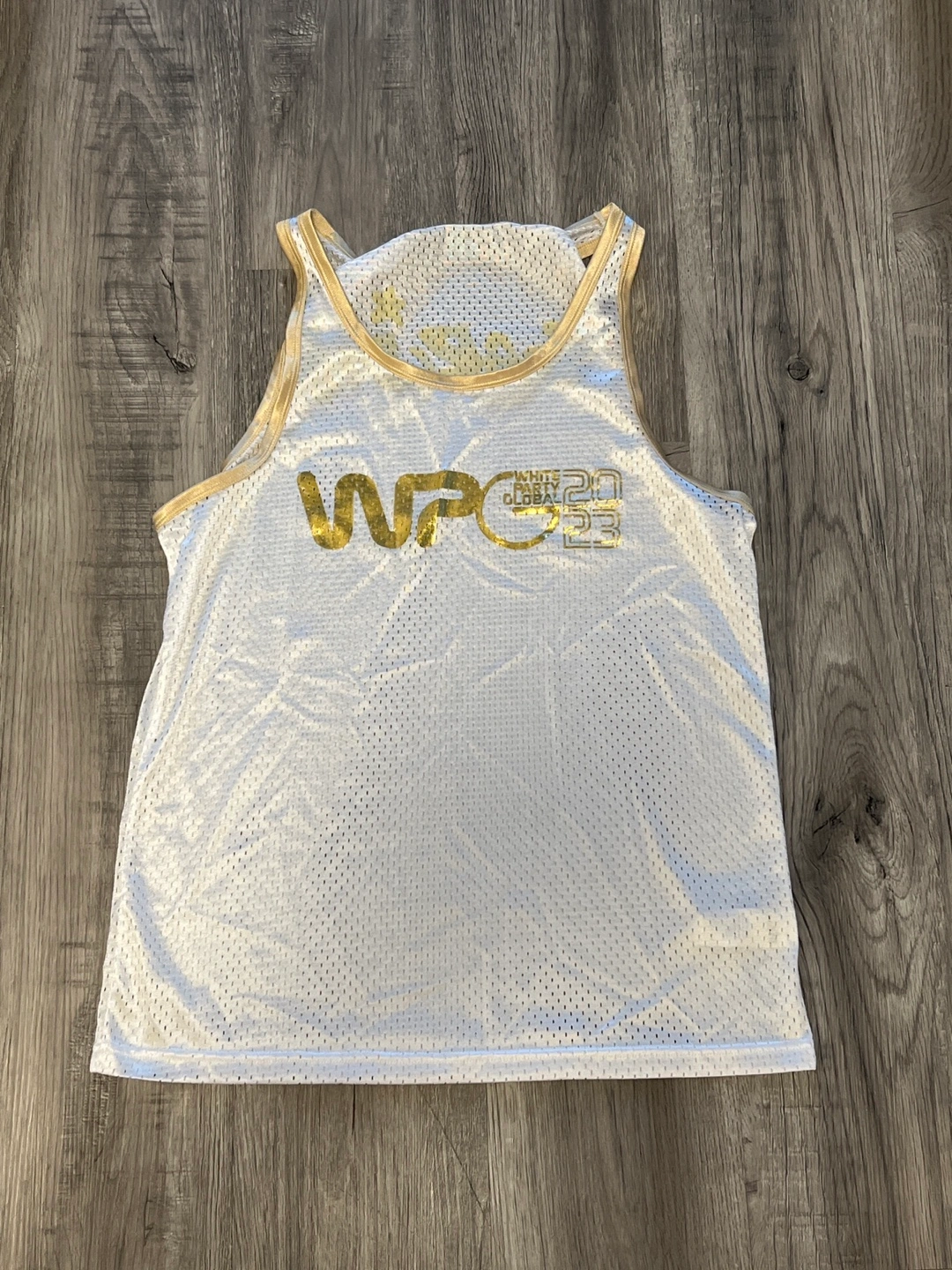 White mesh tank top. Gold lettering on front and back. WPG 2023 Global and Garçon