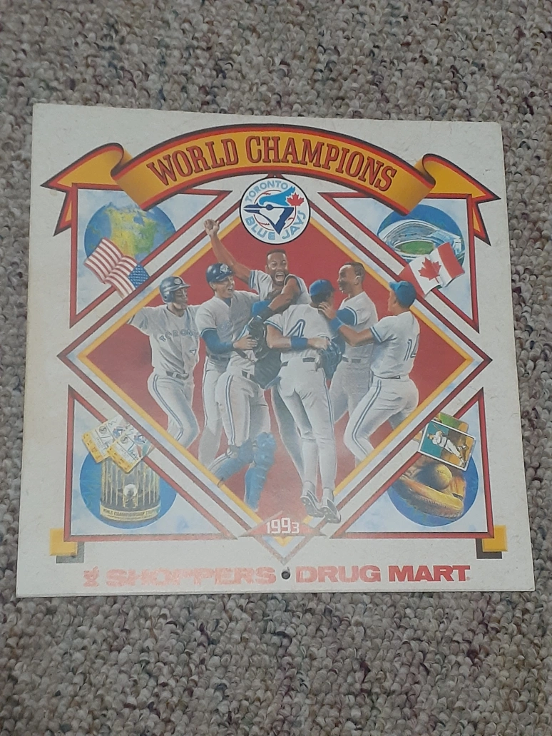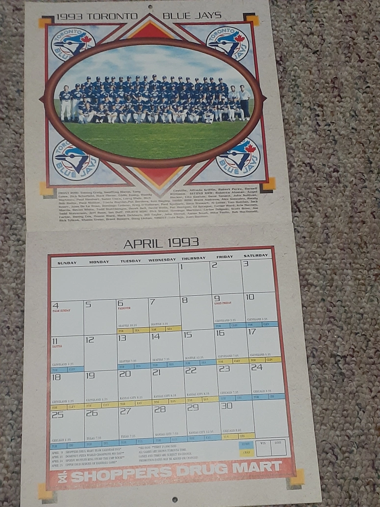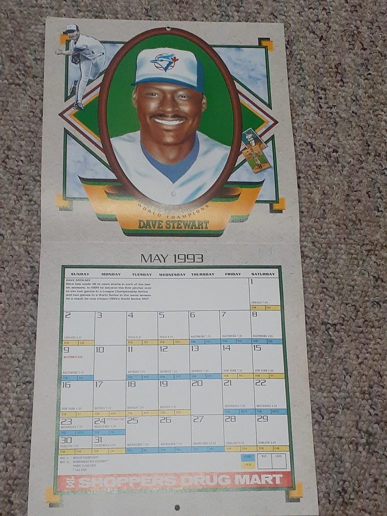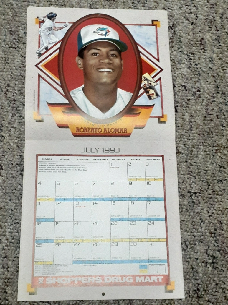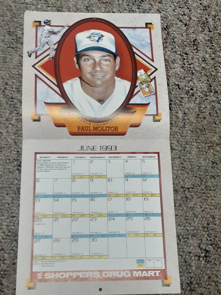Vintage 1993 Toronto Blue Jays calendar. Features Roberto Alomar, Dave Stewart, and Paul Molitor. Includes team roster and schedule. Shoppers Drug Mart promotional item.