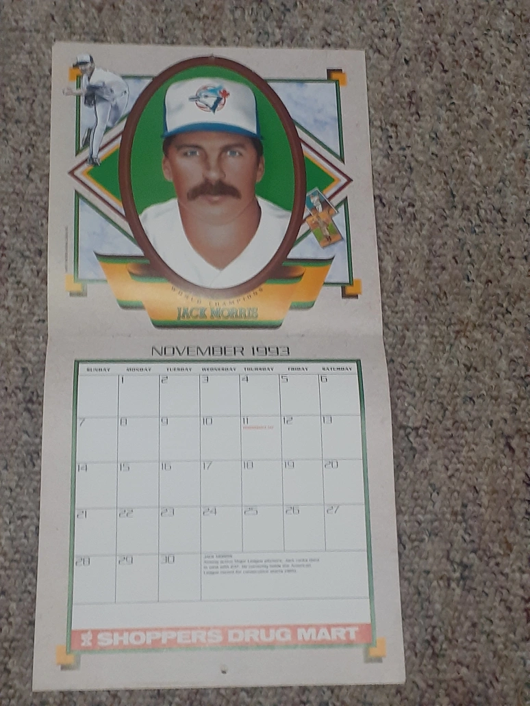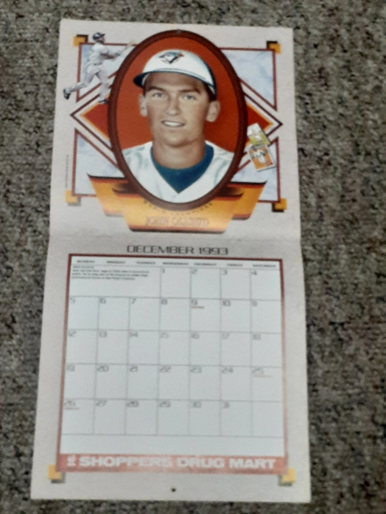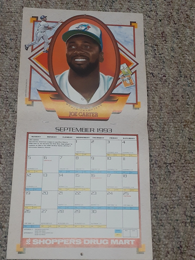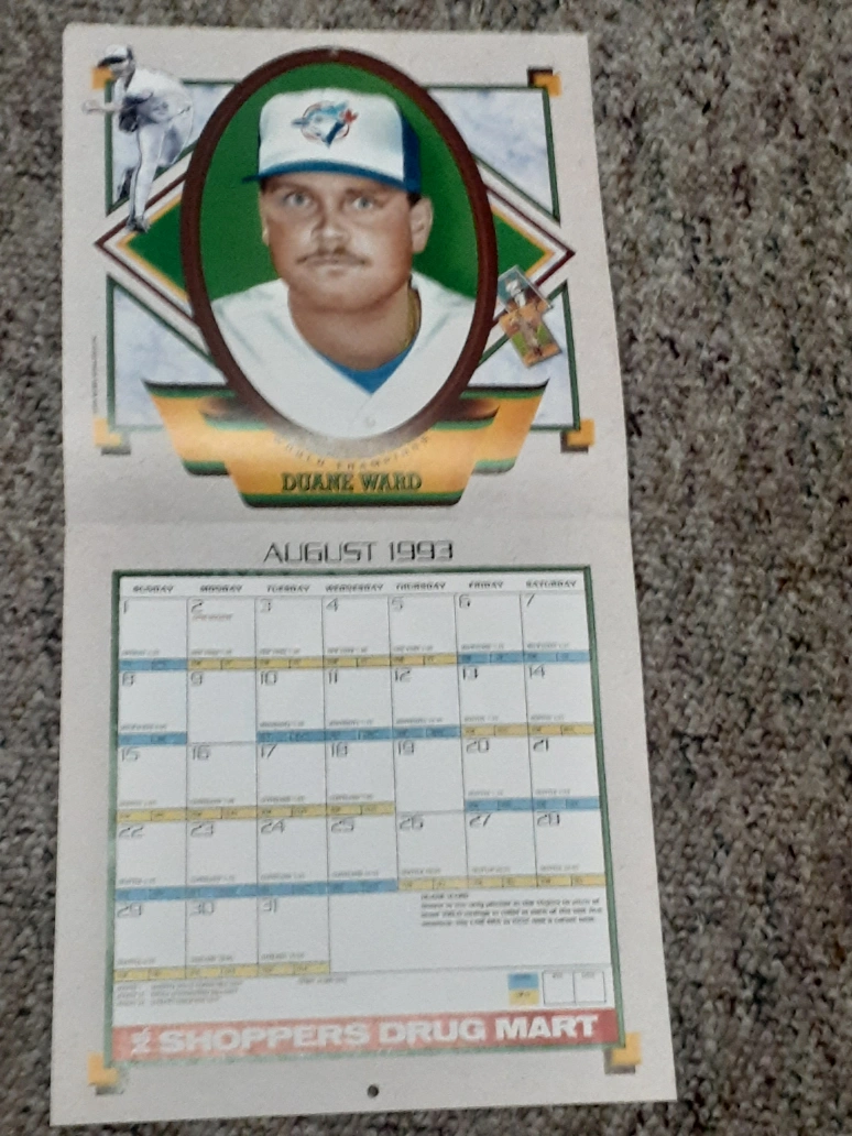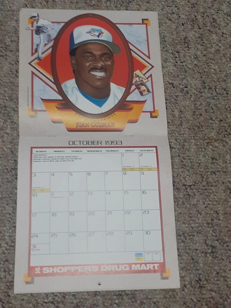 Vintage 1993 Toronto Blue Jays calendar. Features Roberto Alomar, Dave Stewart, and Paul Molitor. Includes team roster and schedule. Shoppers Drug Mart promotional item.