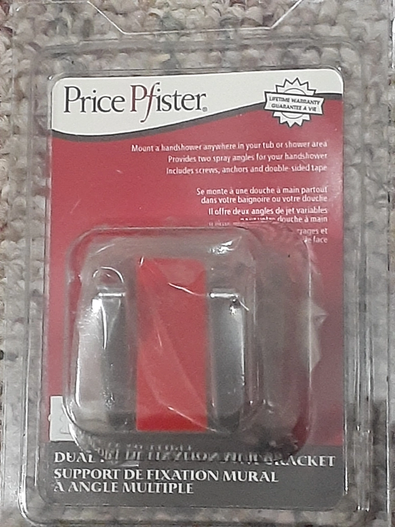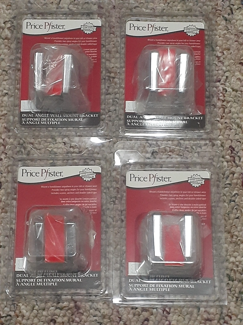 Four packs of Price Pfister dual angle wall mount brackets. Chrome finish. Mounts a handshower anywhere in your tub or shower area. Provides two spray angles for your handshower. Includes screws, anchors and double sided tape. all four for $10