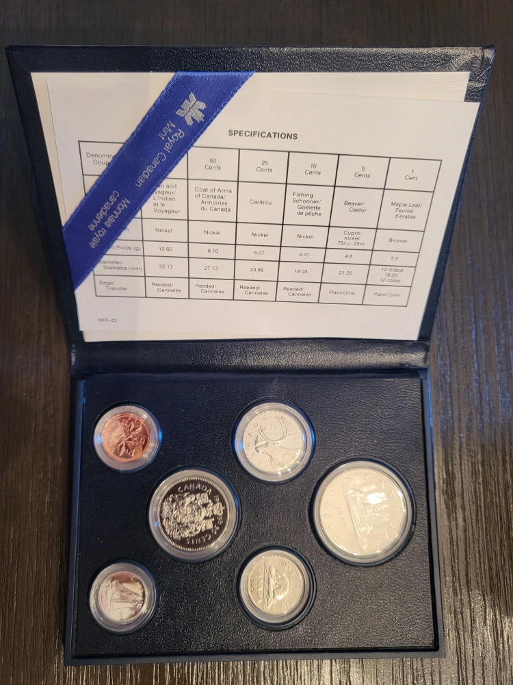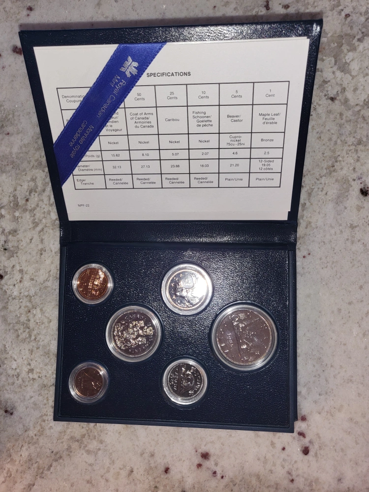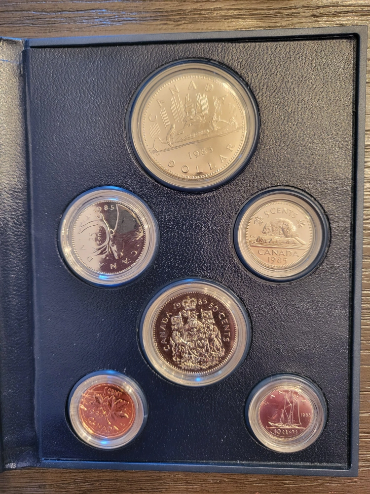 Complete set of 1985 Canadian proof coins. Comes in original packaging. Includes 1 cent, 5 cent, 10 cent, 25 cent, 50 cent, and $1 coin. $35 obo