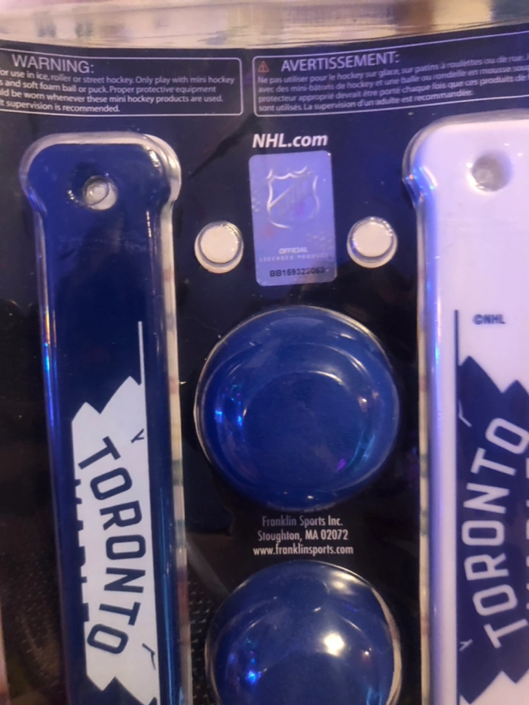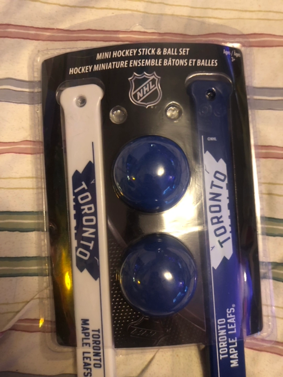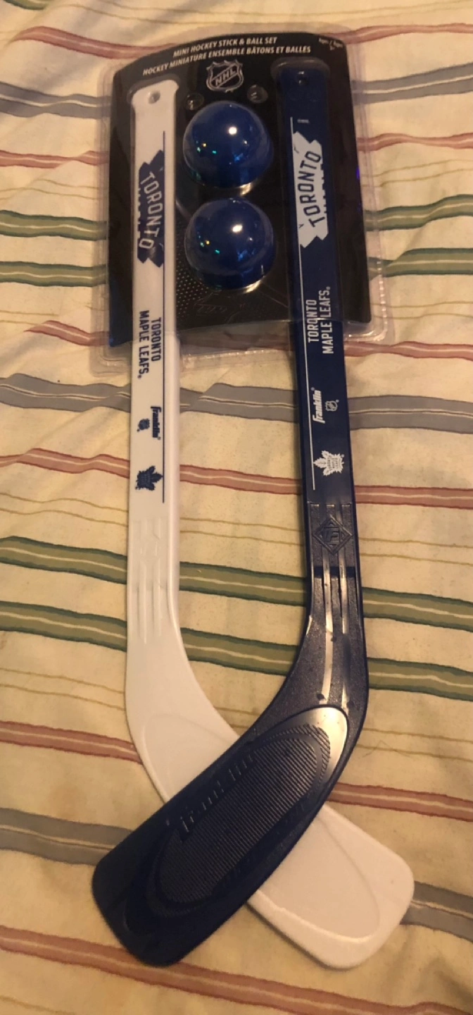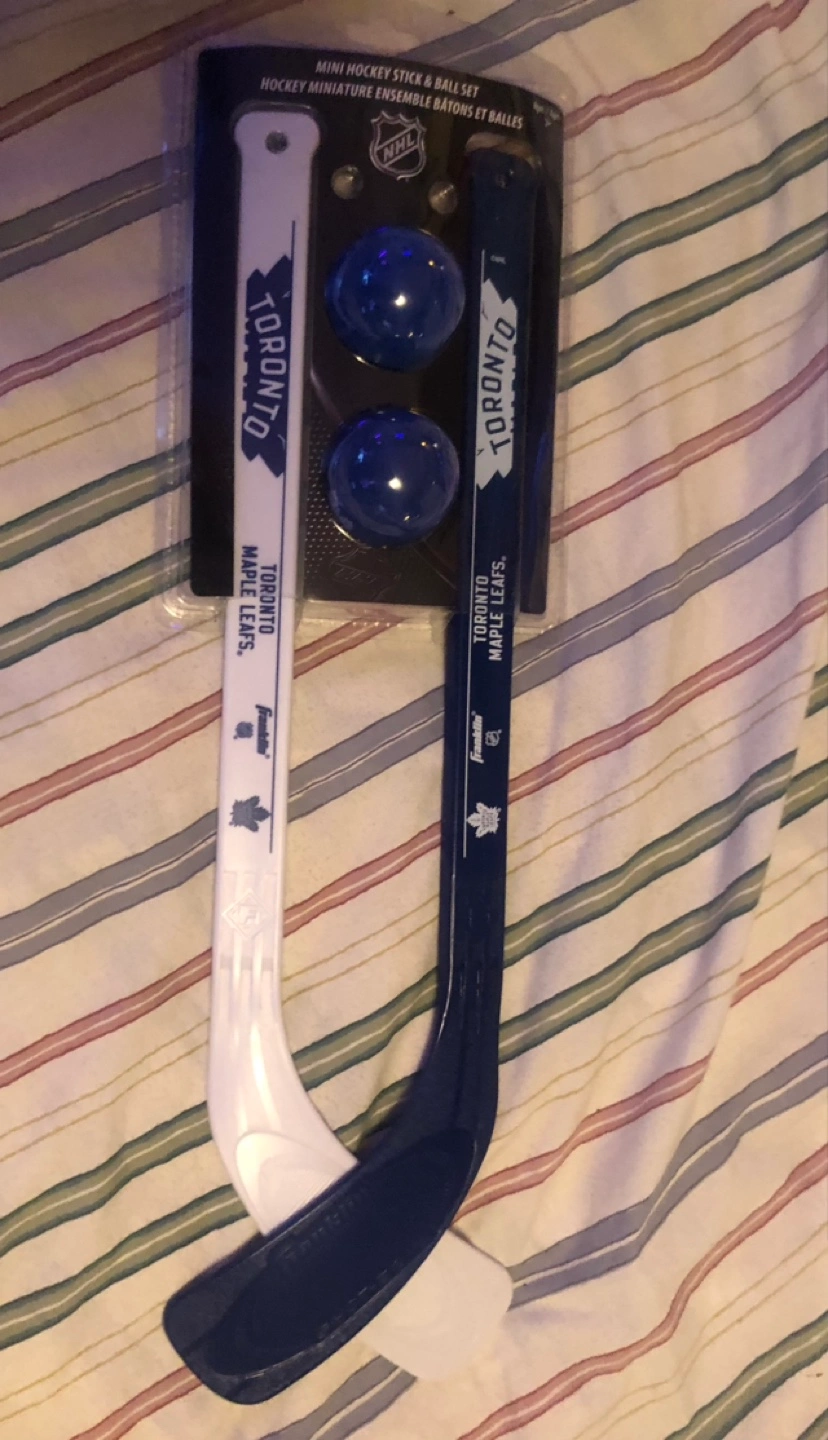 Miniature hockey stick and ball set. Features Toronto Maple Leafs logo and design. Two sticks and two balls included. New in package. Willing to meet up, drop off, or porch pick up.