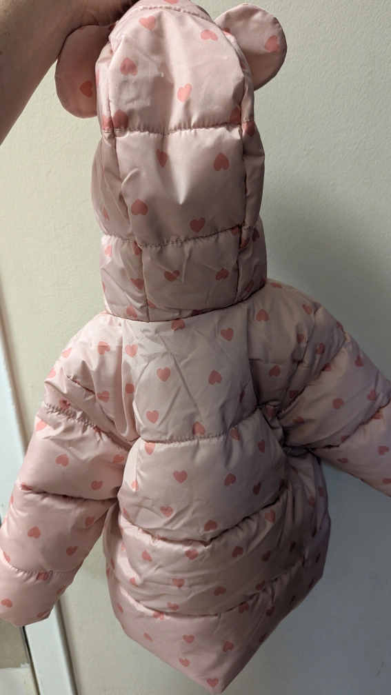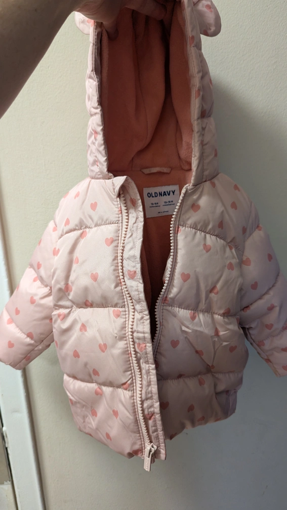 Adorable pink puffer jacket. Features cute bear ears on the hood. Small hearts pattern throughout. Zipper closure. Warm and cozy for your little one. Not used, just took the tags and then a friend found the 18-24 size that my baby is currently using.