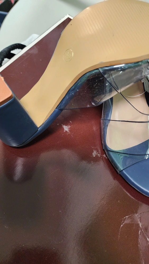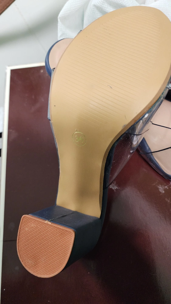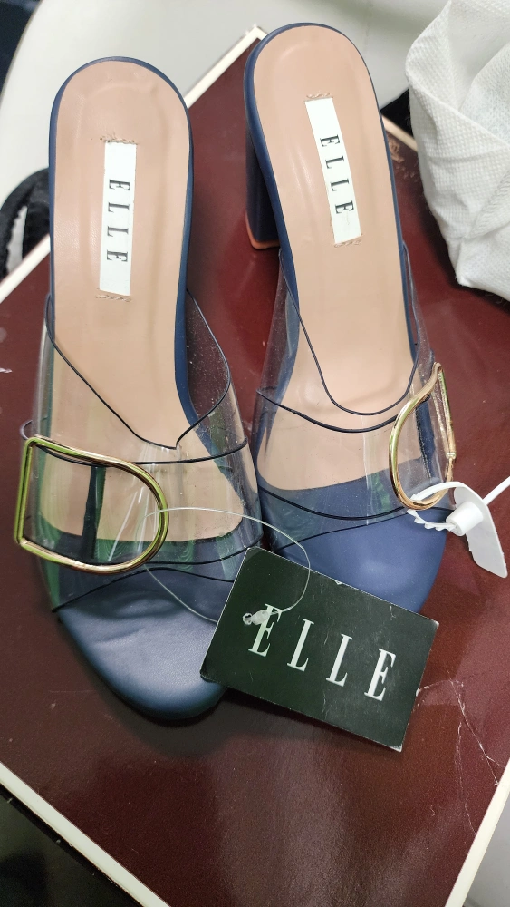 Elegant women's mules. Blue leather upper with clear straps and gold buckle detail. Block heel. Size 5.5 New with tags.