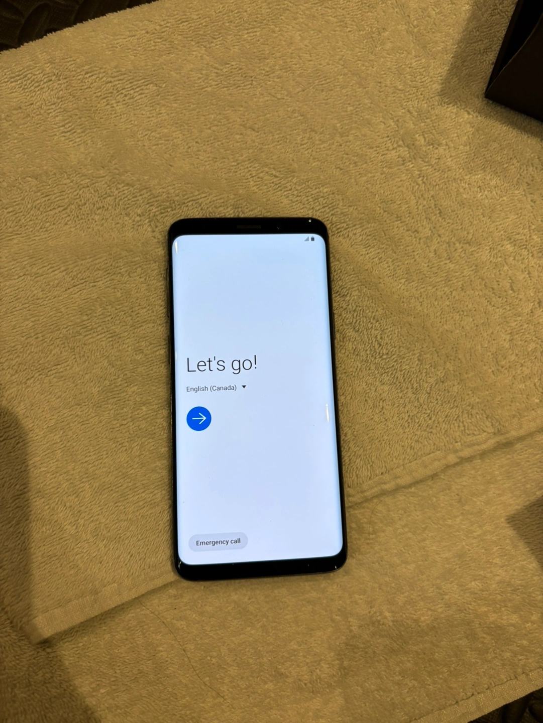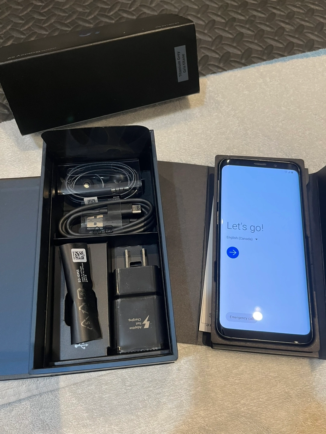 New in box. Unlocked Samsung Galaxy S9 smartphone. Midnight Black colour. Includes original brand new charger, USB cable, and earphones. Pick up only. Updated: priced reduced and throw in 2 brand new cases.