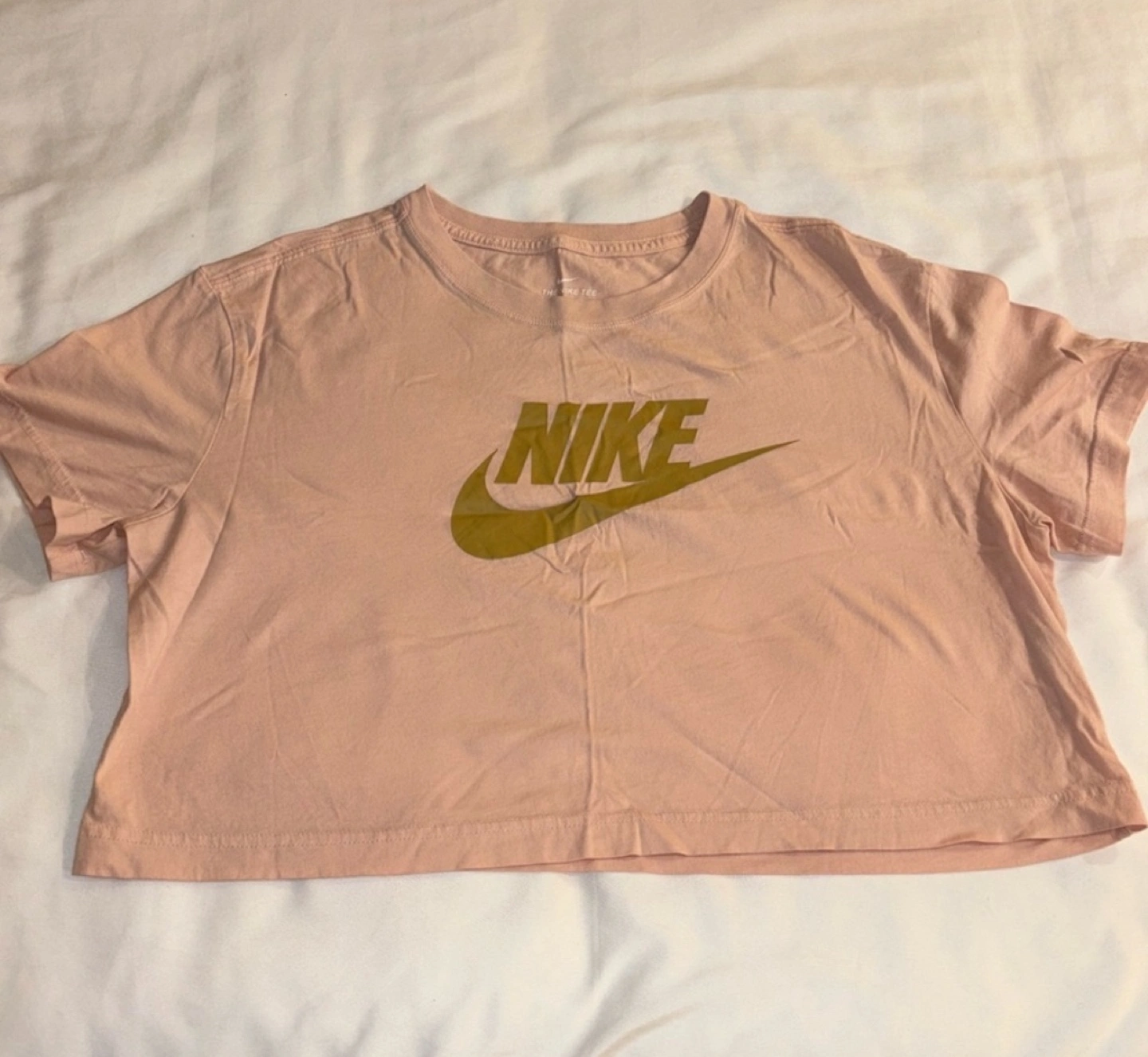 Women's cropped t-shirt. Pink shirt with gold Nike logo. Short sleeves. Casual style.