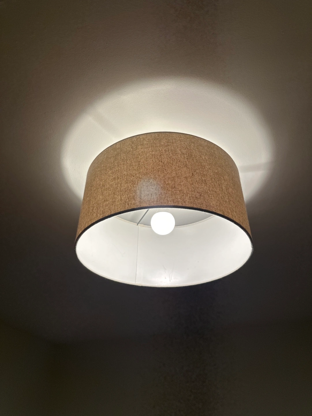 Neutral coloured drum shade. Simple design. Great for bedrooms or hallways. Comes with lightbulb.