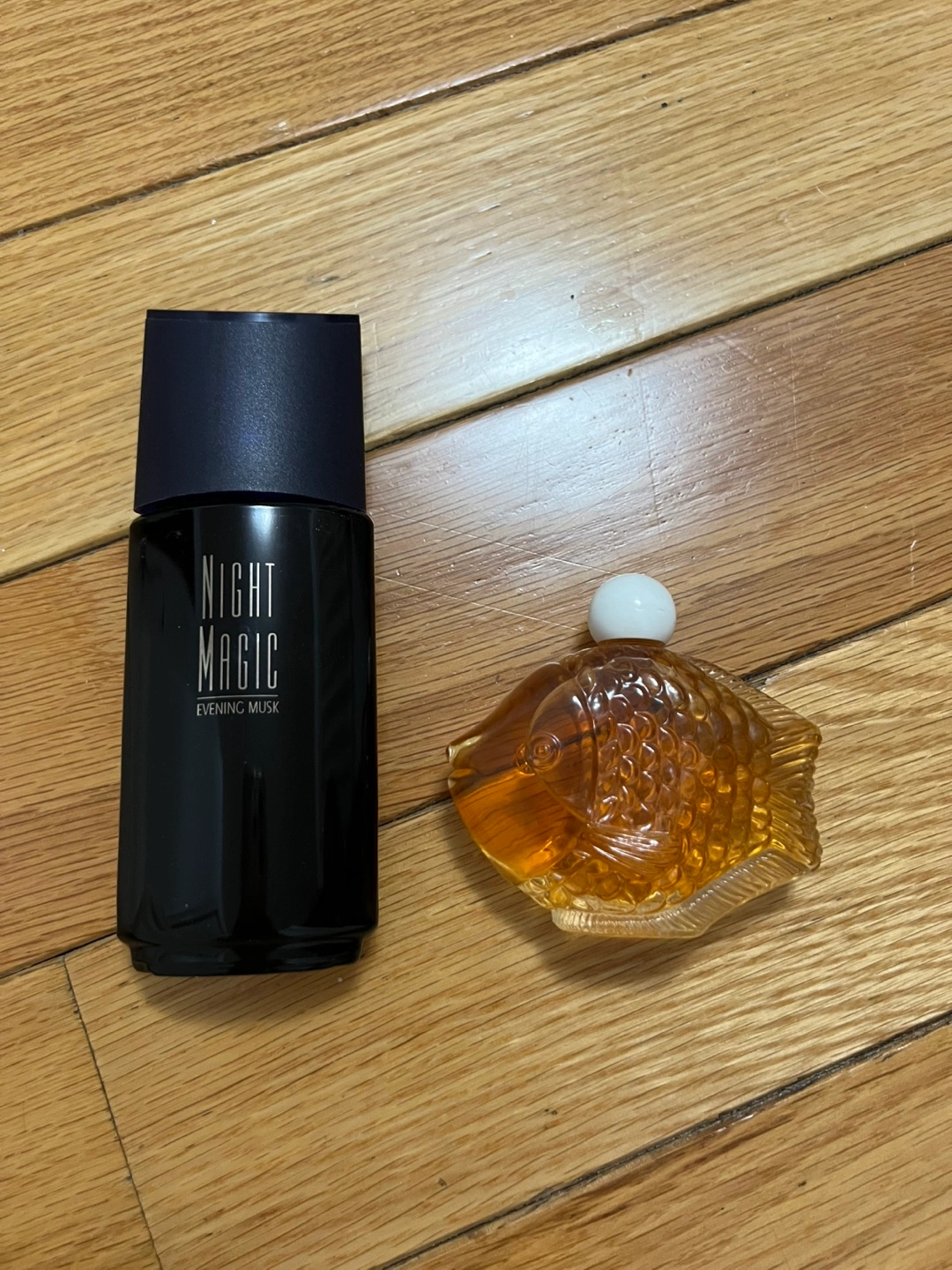 Two perfumes for sale. One is Night Magic Evening Musk. The other is a vintage perfume in a fish-shaped bottle, also Night Magic scent.
