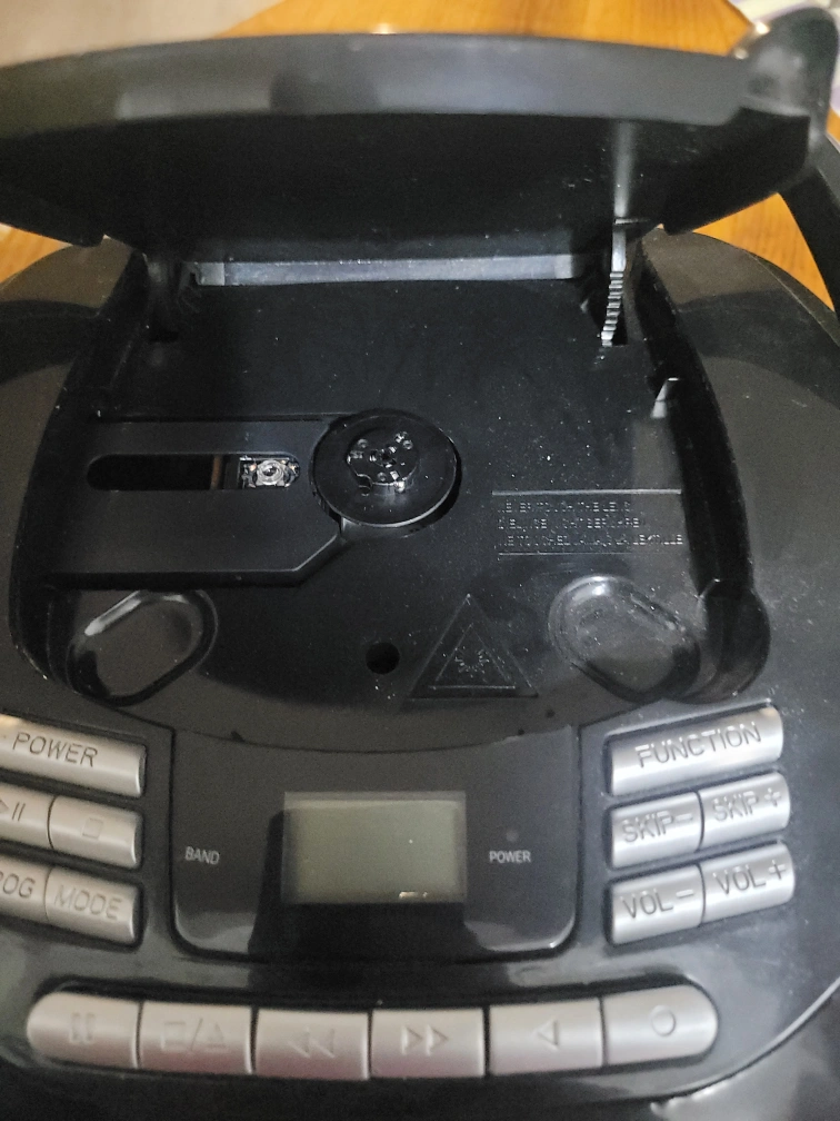 Black CD boombox. Plays CDs and radio. Features volume control, track selection buttons, and band selection. Portable design with integrated handle. Includes power cord.