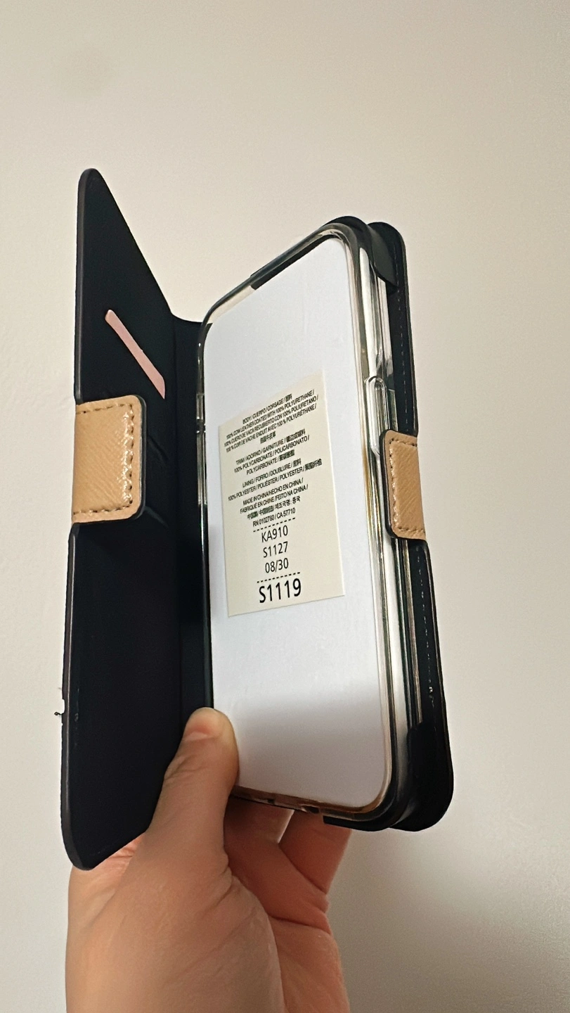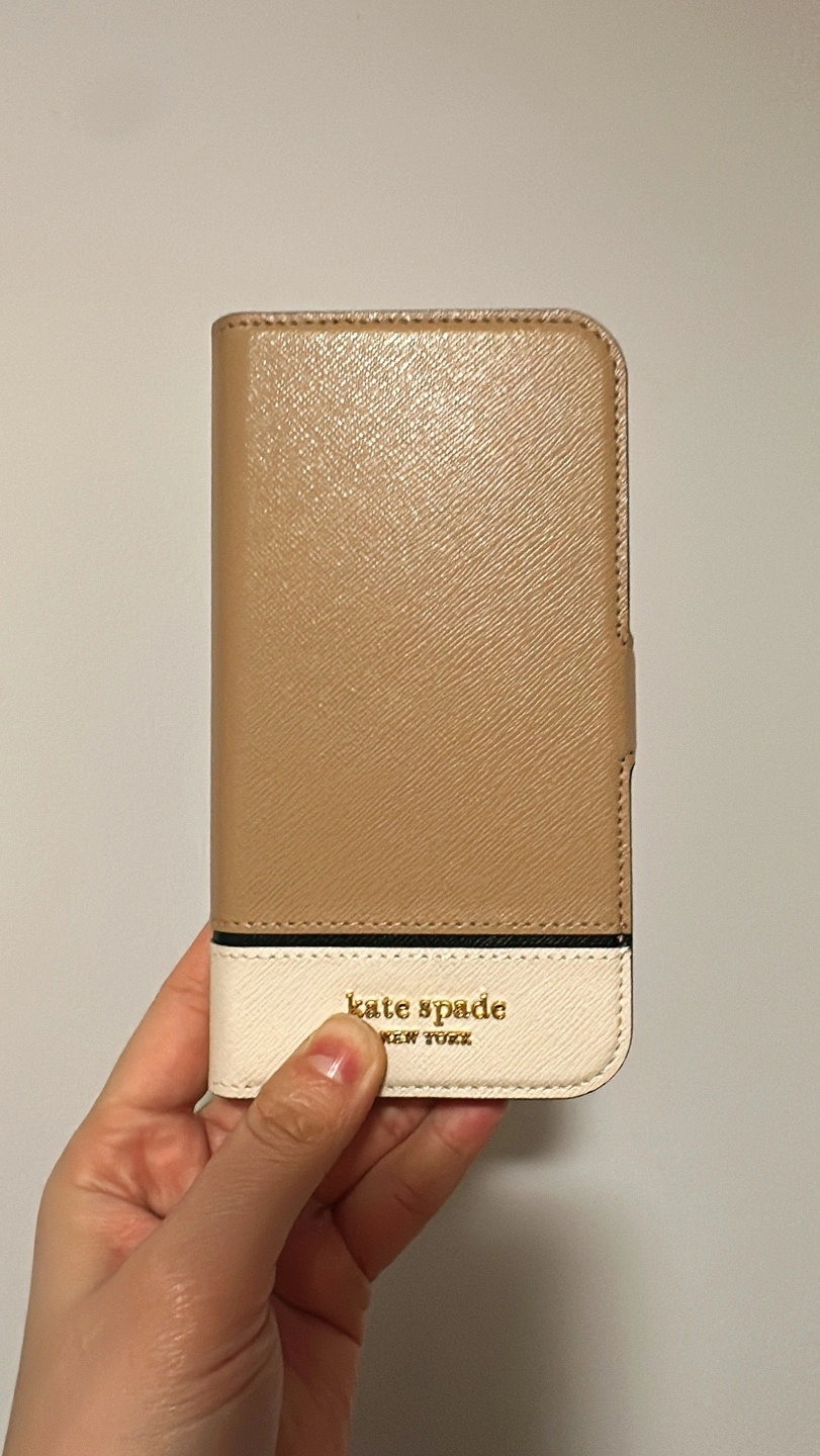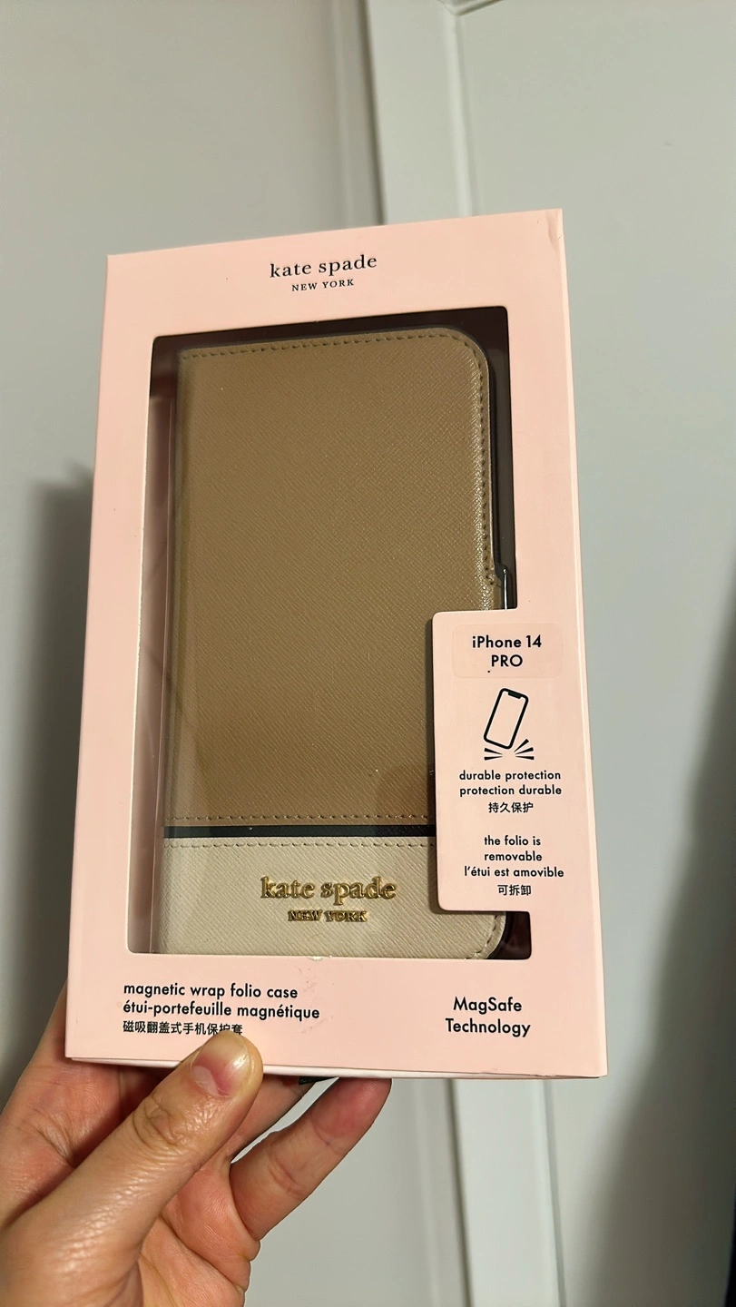 This is a magnetic wrap folio phone case in beige and light brown (mocha) colour for iPhone 14 Pro by Kate Spade. The wrap folio part can be separated when not in use as you can see in the photo, and it can be attached again with inserted magnets in the phone case. On the left side of the wallet, there are three slots in which you can place 3 cards of your choice. This item is like new. This would be a great gift for a member of a family, friend, or even for yourself! Retail price: $118.00 size: iPhone 14 Pro