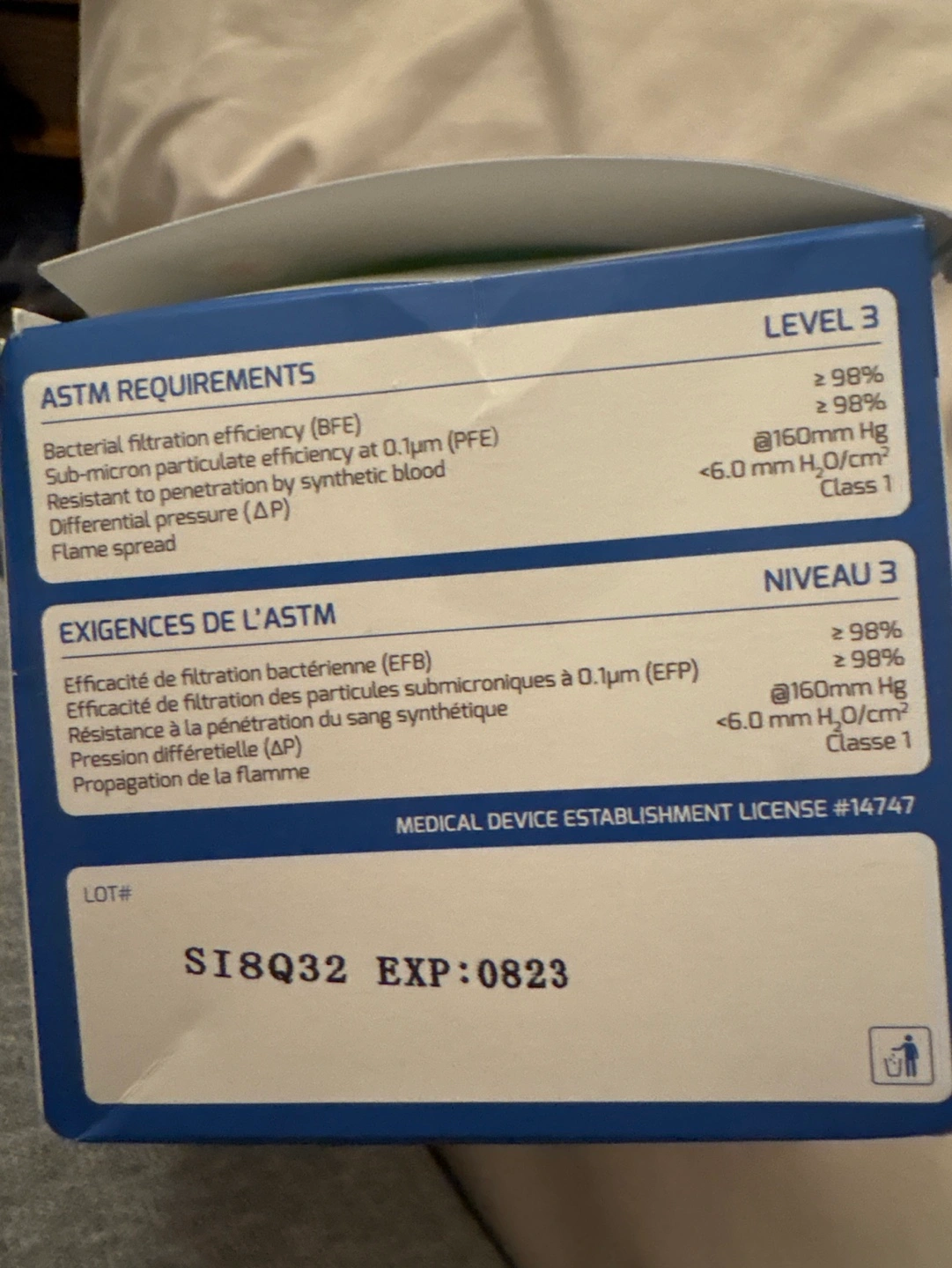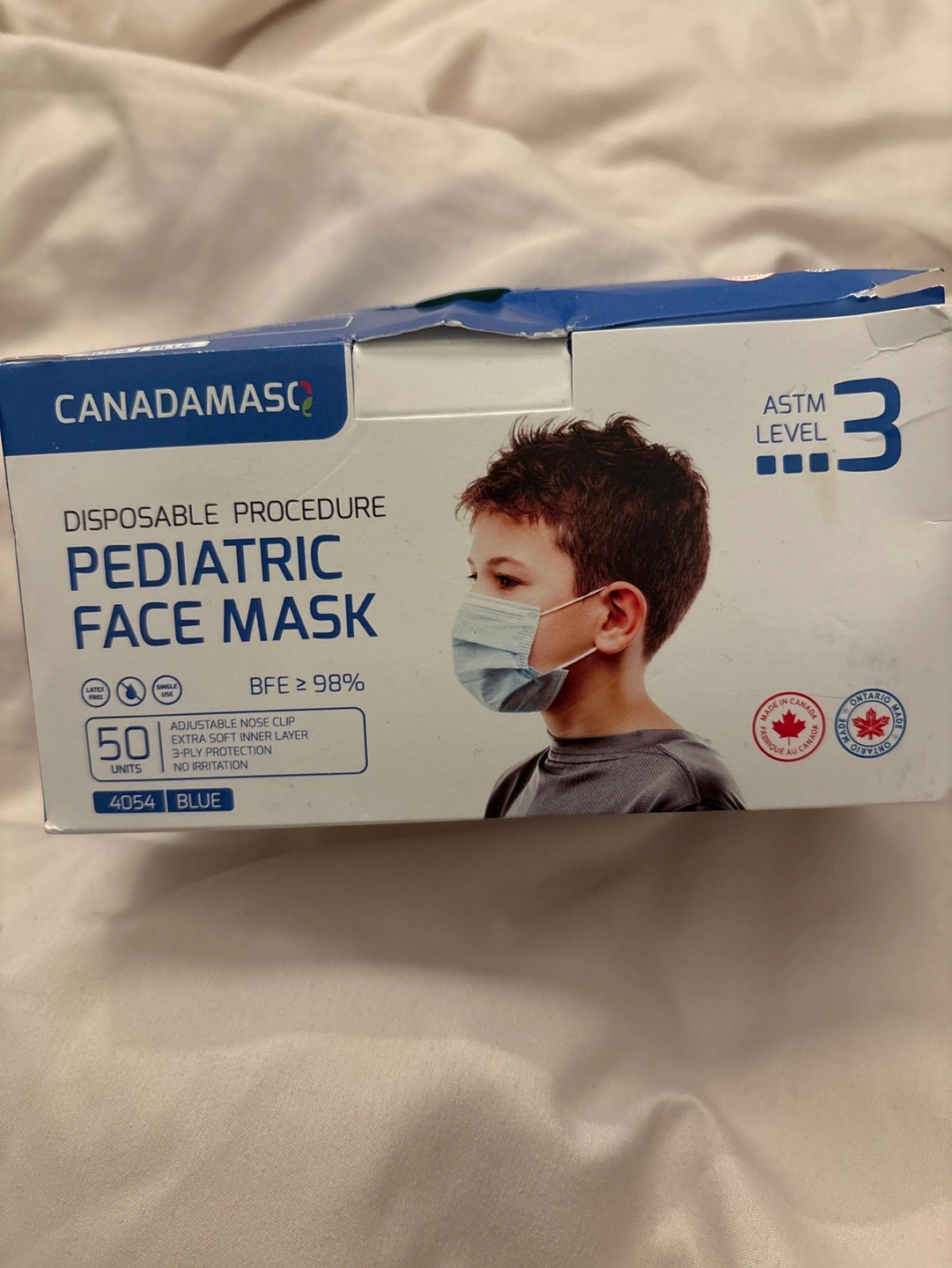 Box of 50 blue disposable pediatric face masks. Level 3 ASTM. Adjustable nose clip. BFE ≥ 98%. Made in Canada. Expiry 08/23.