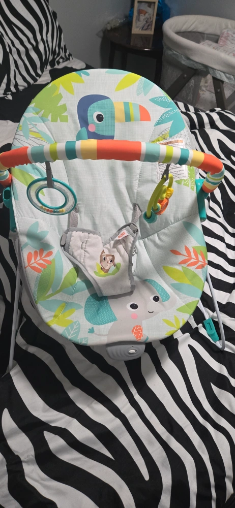 Adorable baby bouncer, jungle theme. Features multiple toys. Vibrating function. Great condition.