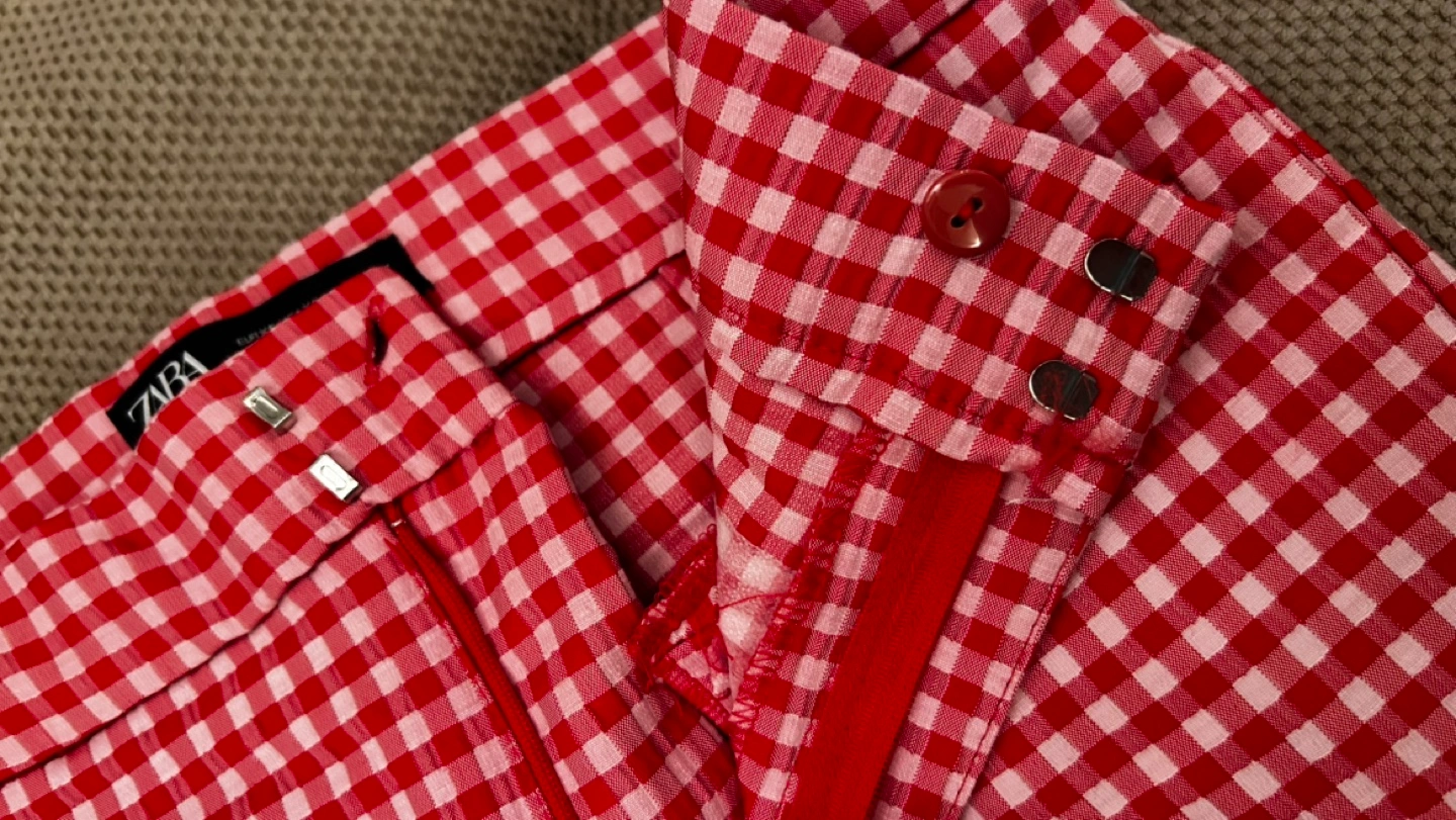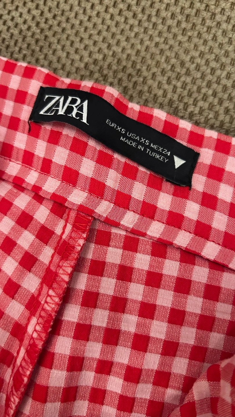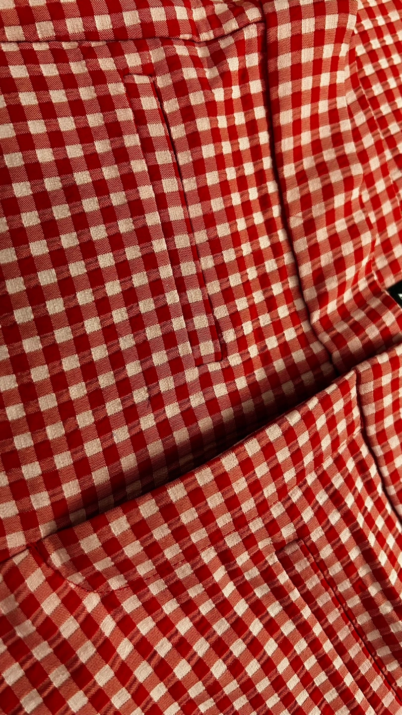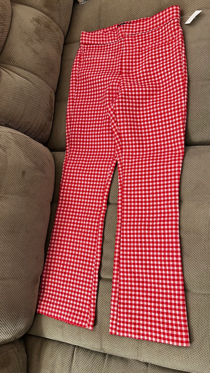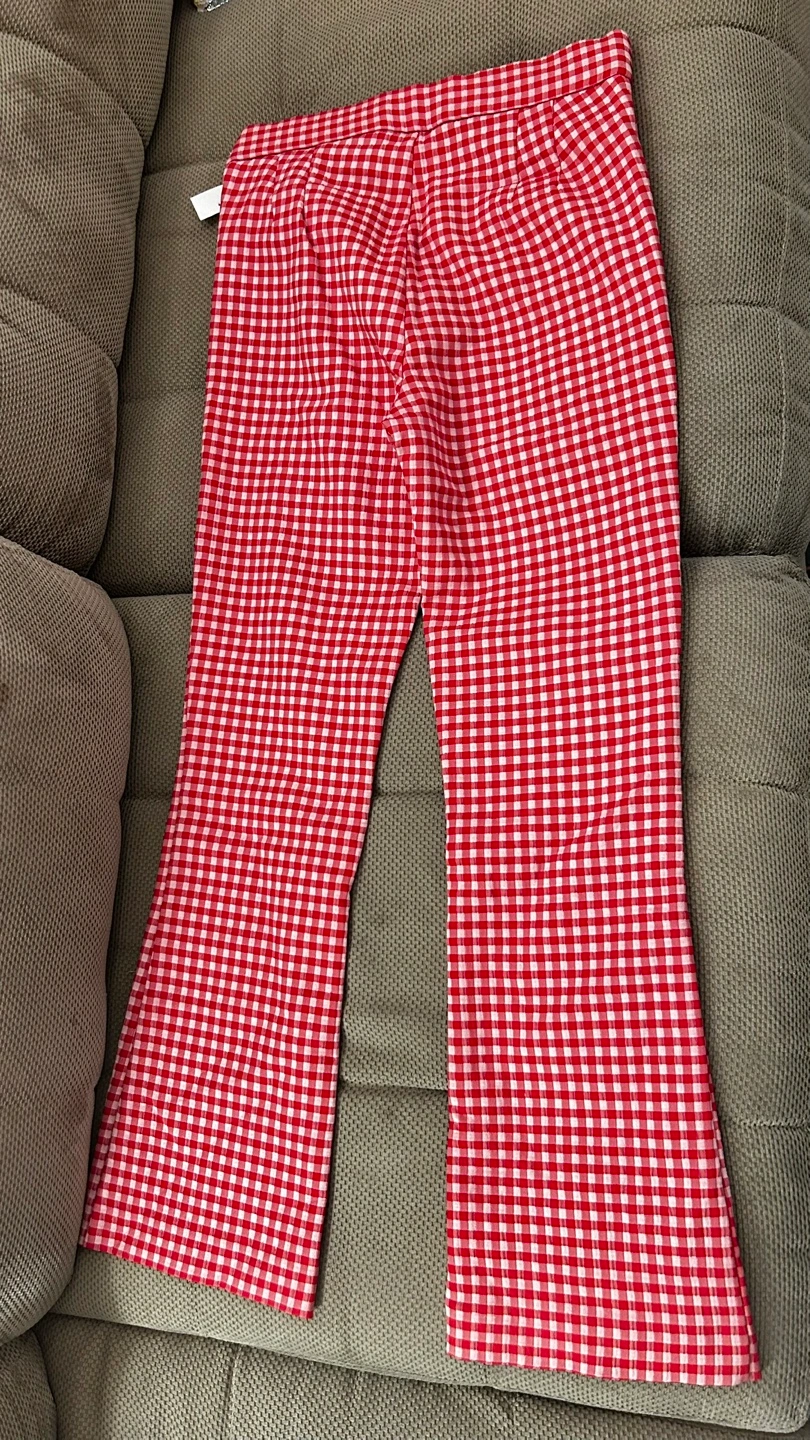 Red and white gingham flare pants. Size XS. Made in Turkey. Button and zipper closure. Two pockets.