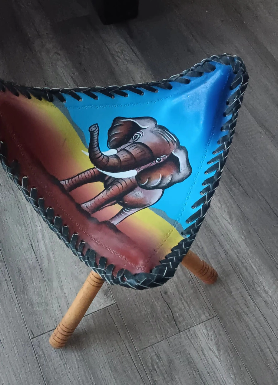 Afrian triangular stool. Features hand-painted elephant design. Leather seat. Wooden legs. Compact and portable.