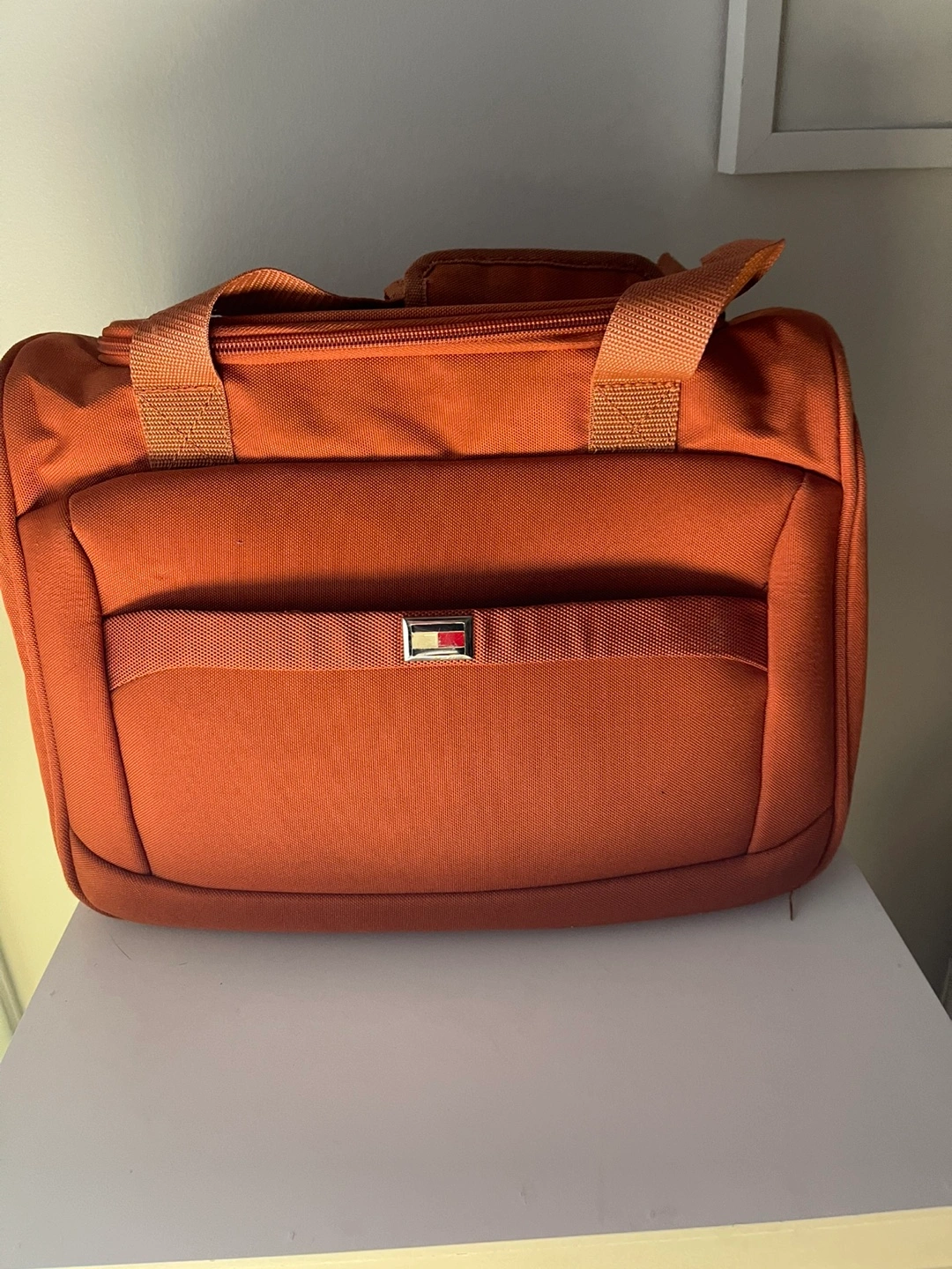 Compact travel bag. Burnt orange colour. Features a removable shoulder strap, top handles, and interior organizer. Zipper closure. Great for weekend getaways or overnight trips.