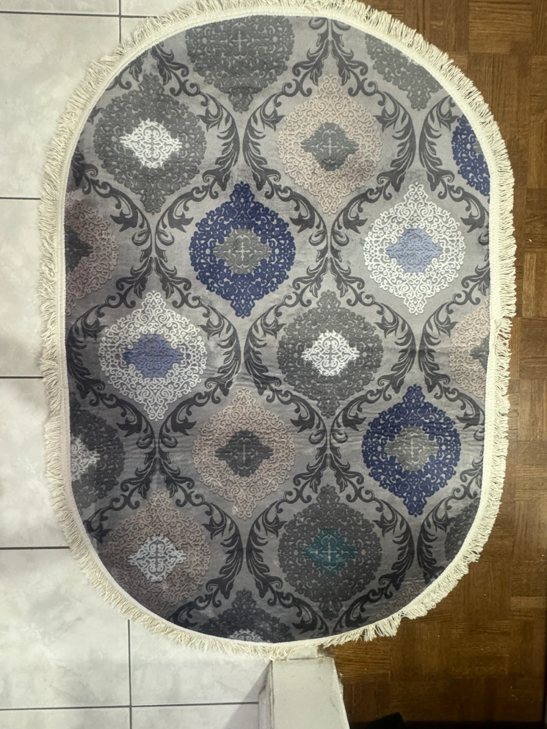 Oval rug, grey base with blue and beige accents. Features a fringed edge. Machine washable. More patterns in stock. #thriftypicks
