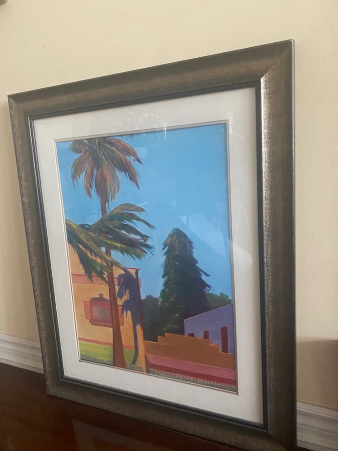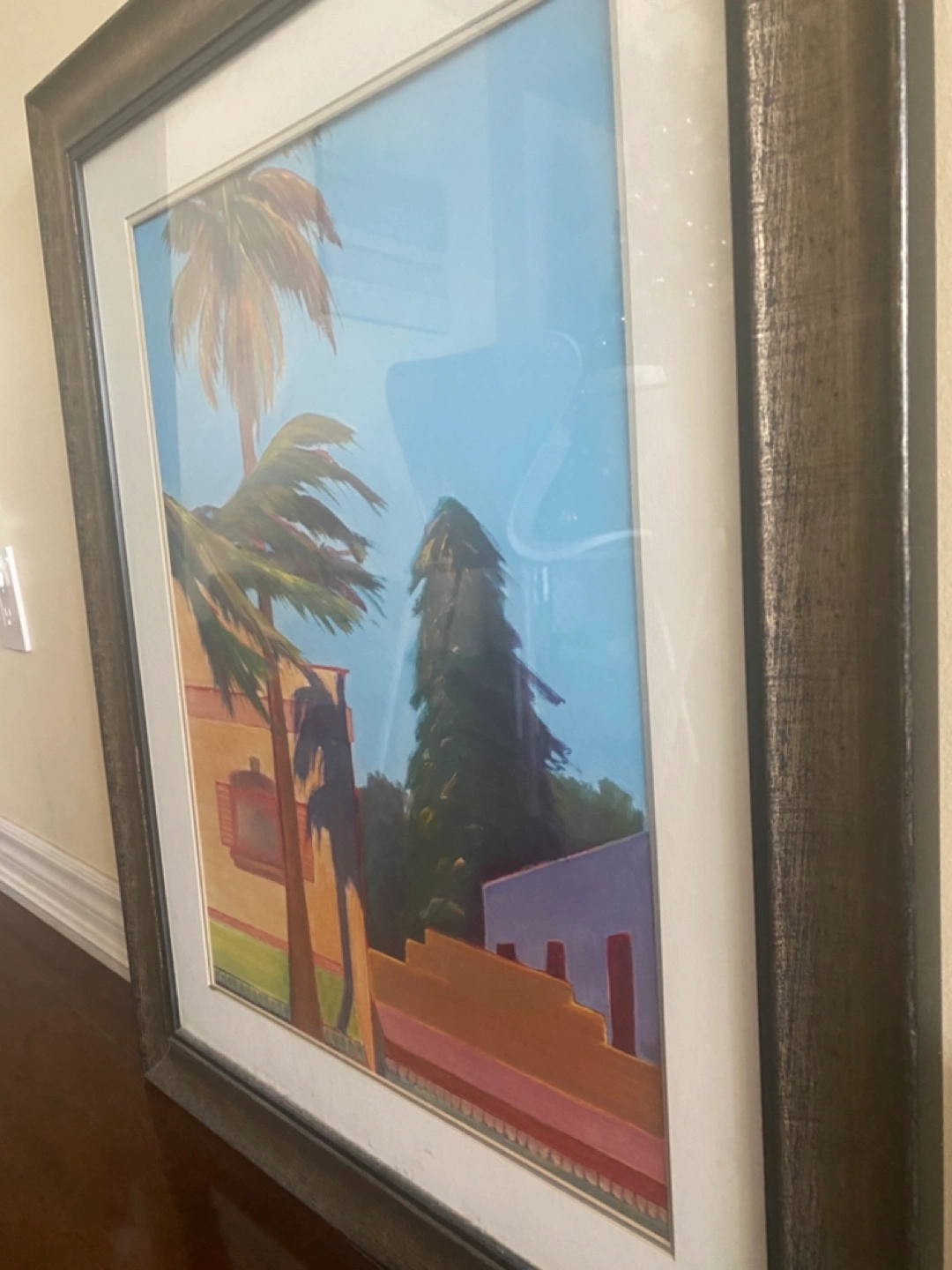 Beautiful framed artwork. Depicts a tropical scene with palm trees and buildings. Dark brown frame. Ready to hang.