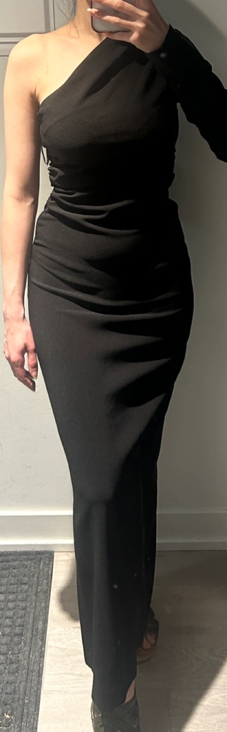 Elegant black Long dress. One-shoulder design. Long sleeve on one side. Fitted silhouette. Centre back slit. Size small.