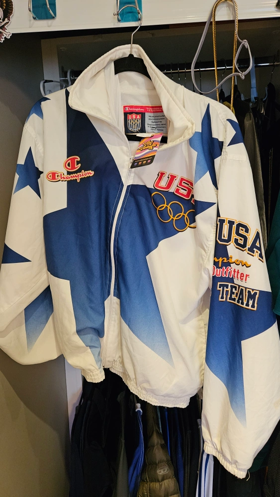 Rare vintage Champion jacket. Features a unique design with USA Olympic theme. Full zip closure. Great for collectors or fans of vintage sportswear.