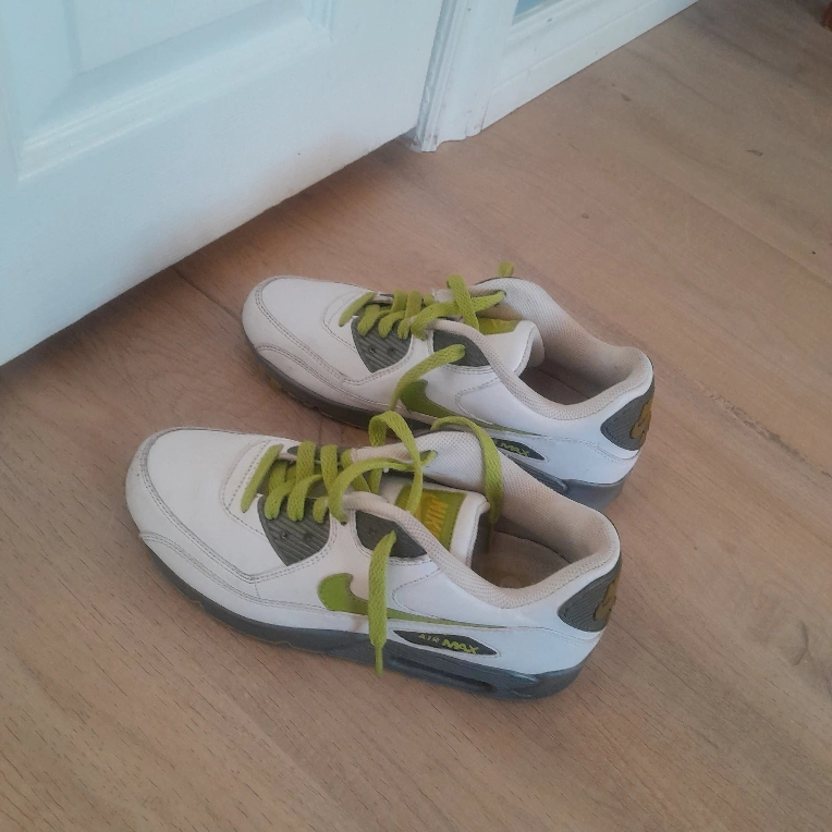 White leather Nike Air Max 90 sneakers. Lime green laces. Grey accents. Pre-owned.