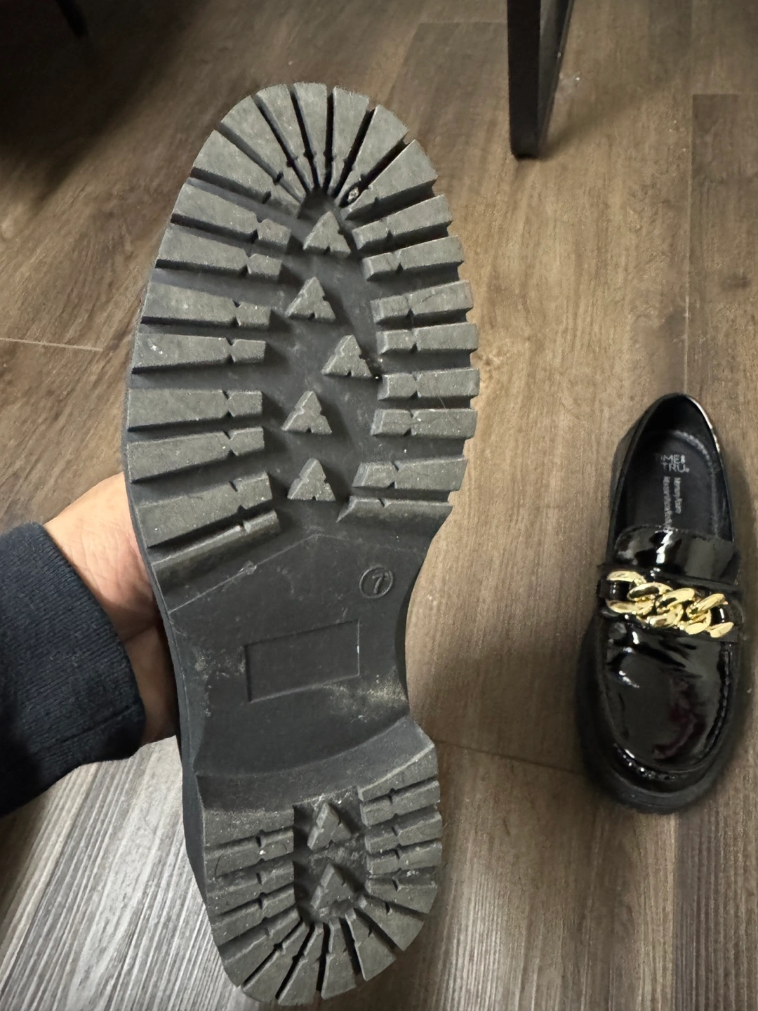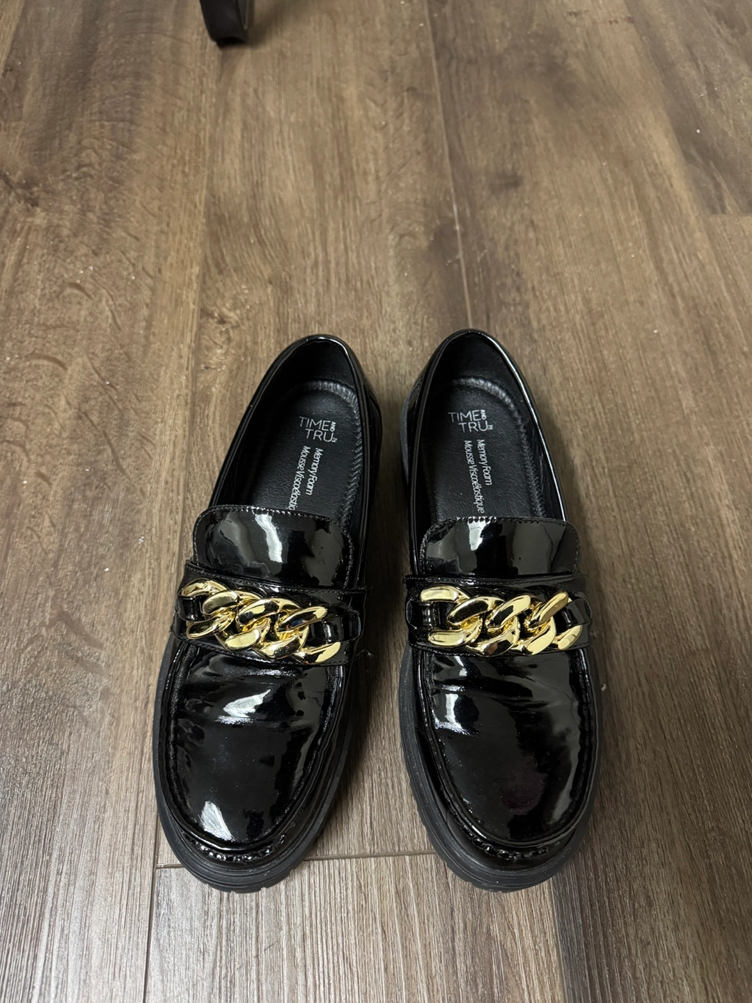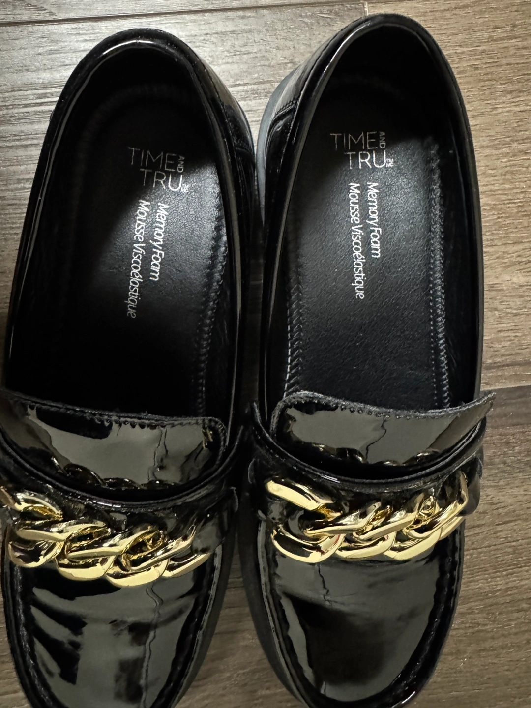 Women's black patent leather loafers. Features a chunky sole and gold chain accent. Memory foam insole for comfort. Size 7.