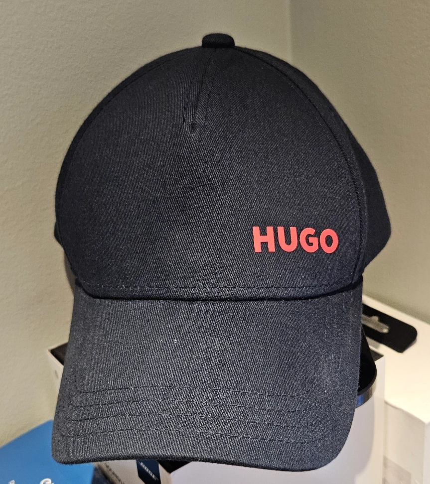 Black baseball cap. Features red Hugo logo. Adjustable strap. Great condition.
