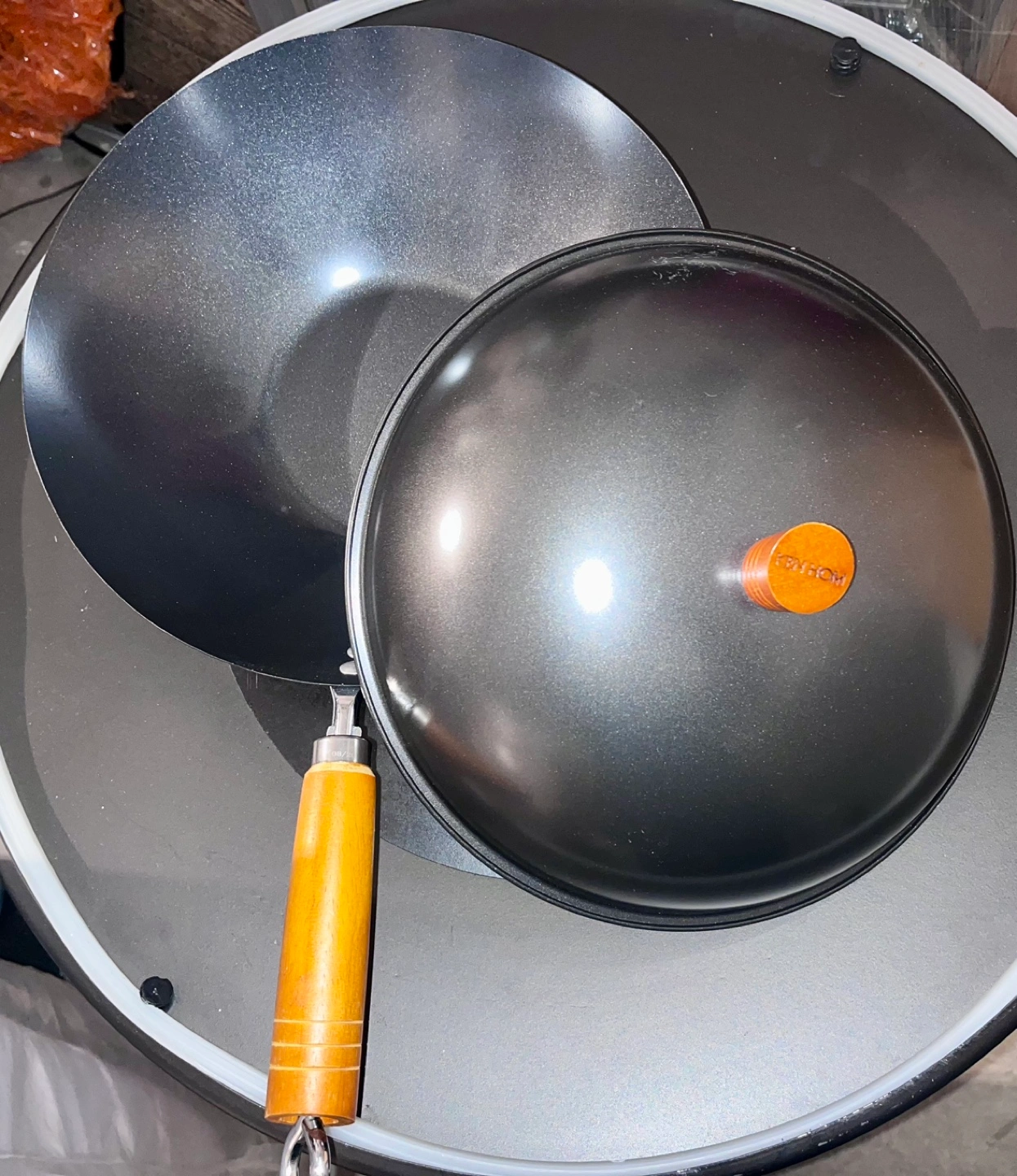 Pre-owned Ken Hom wok and lid. Round shape. Wooden handle. Black colour. Used once.