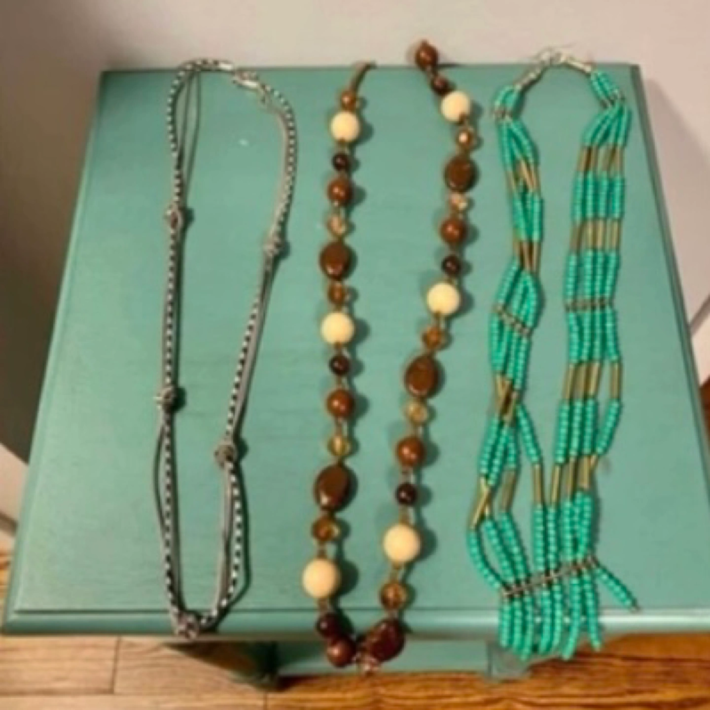 10.00 each or 2 for 16.00 One features brown and cream beads. Another has turquoise and gold beads. The third is a silver chain necklace. Pickup and cash