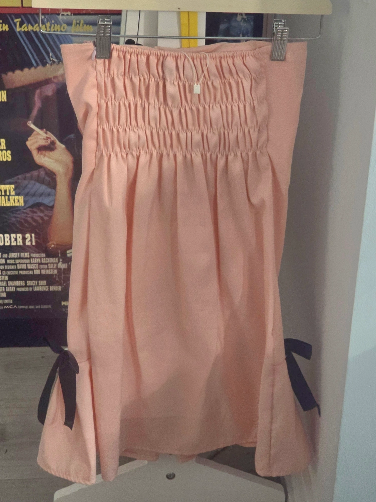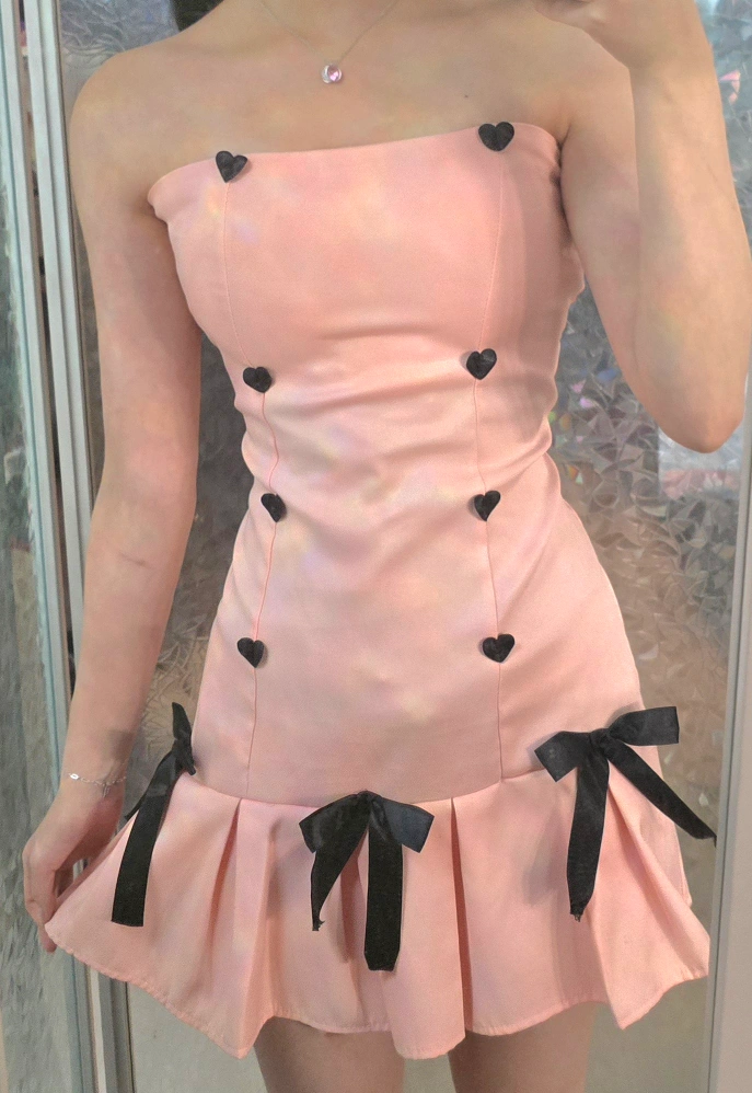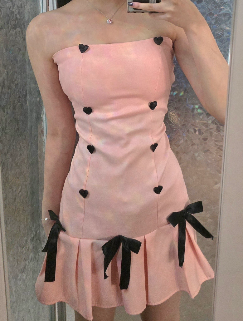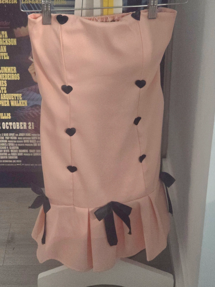 Adorable pink mini dress. Strapless, features black heart buttons and bows. Perfect for a special occasion. Unspecified size but fits like a small. Price negotiable & open to trades. Delivery possible to most line 1 and line 2 stations.