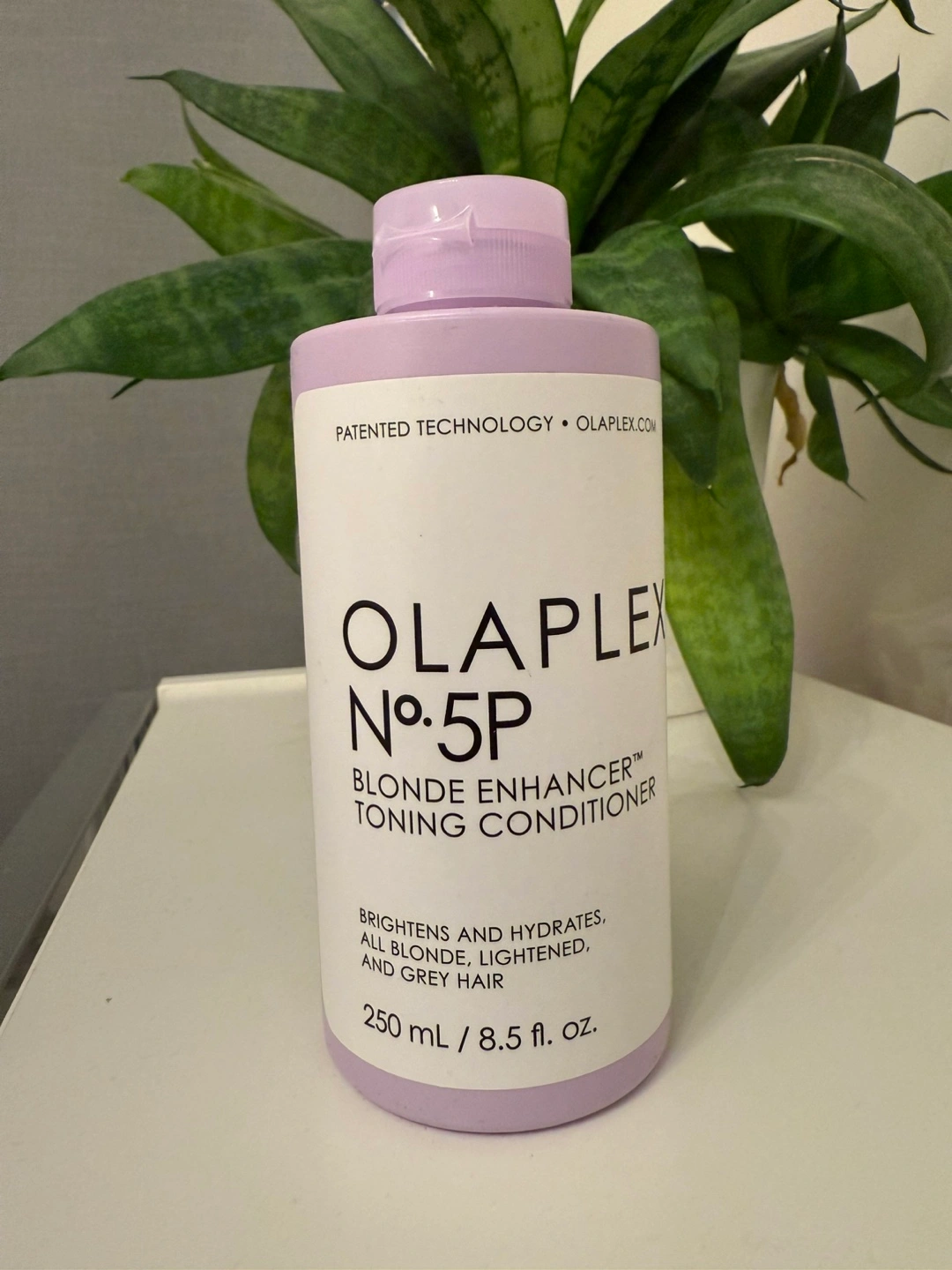 Olaplex No.5P Blonde Enhancer toning conditioner. Brightens and hydrates all blonde, lightened, and grey hair. 250ml bottle.