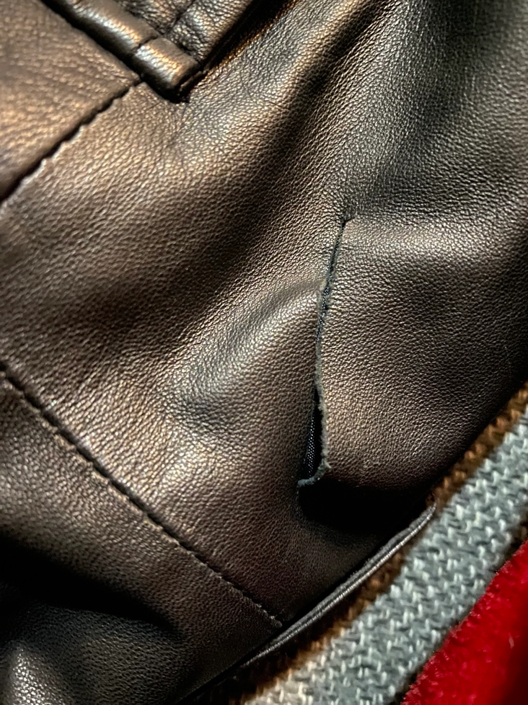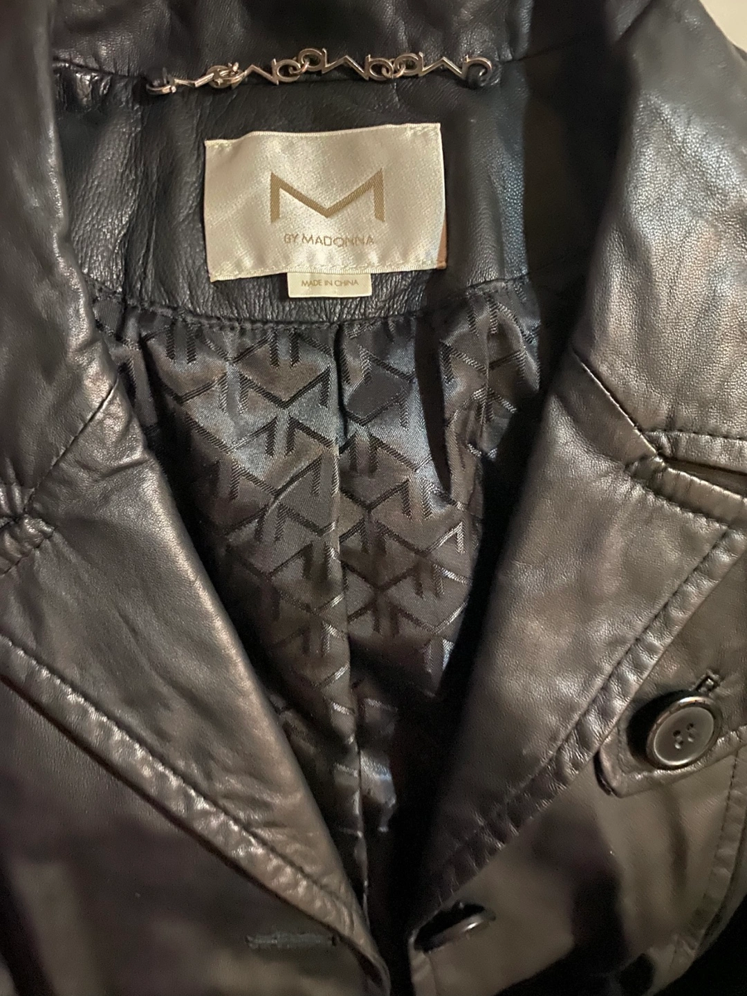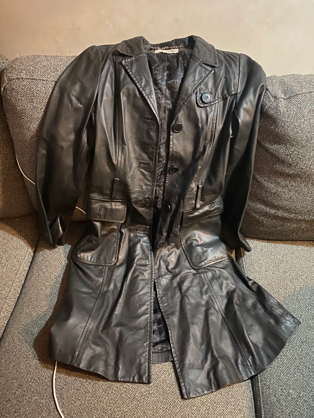 Long black faux leather coat. Button closure. Minor damage shown in image. Missing belt. Never worn