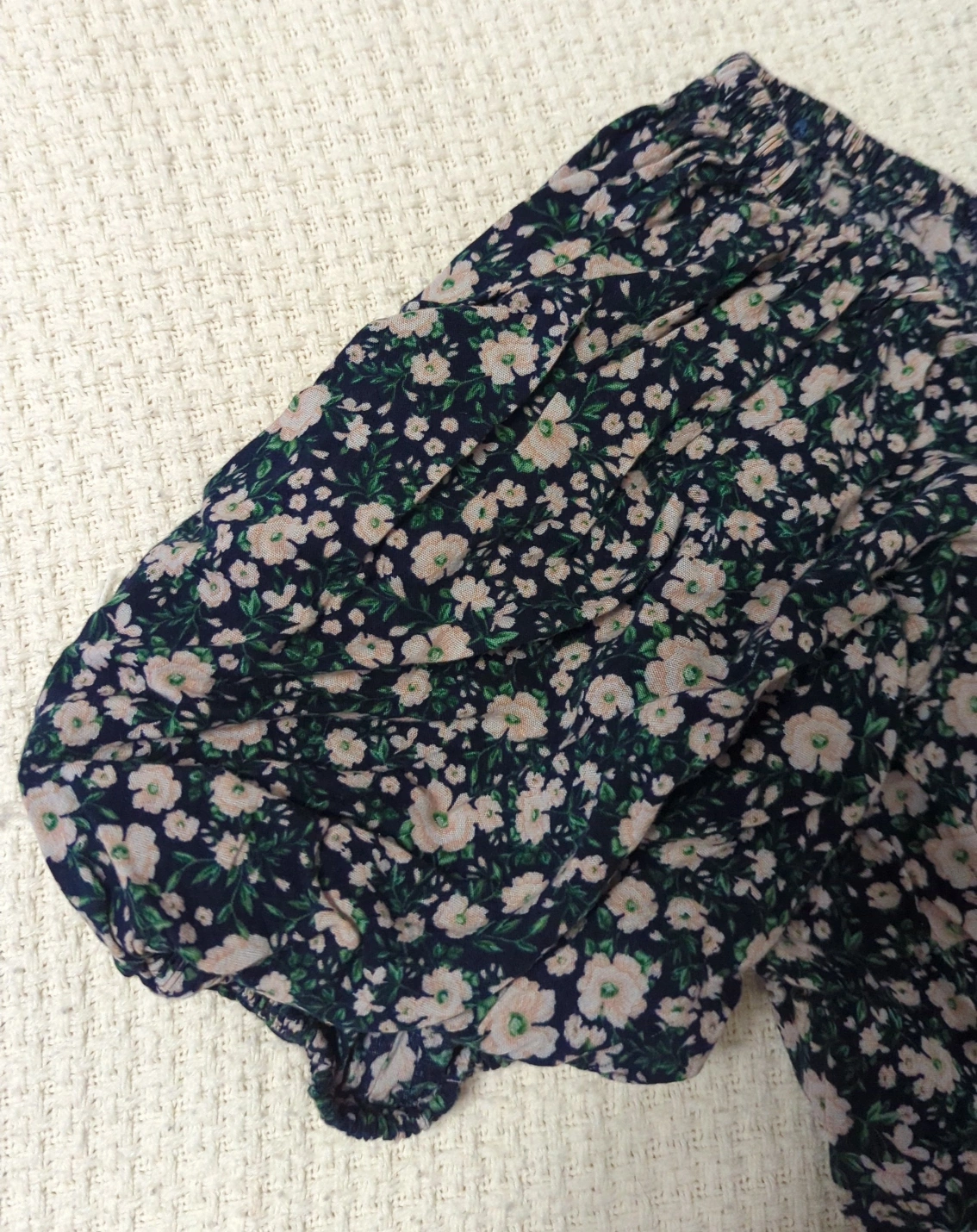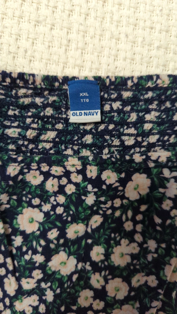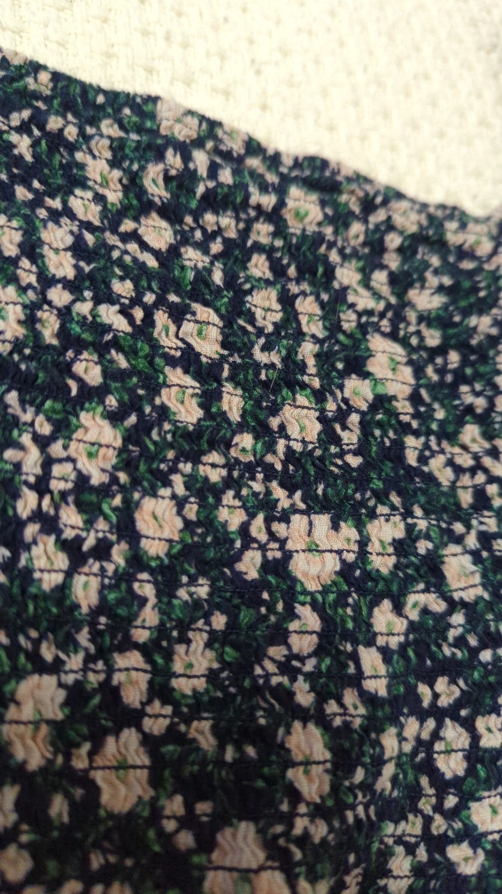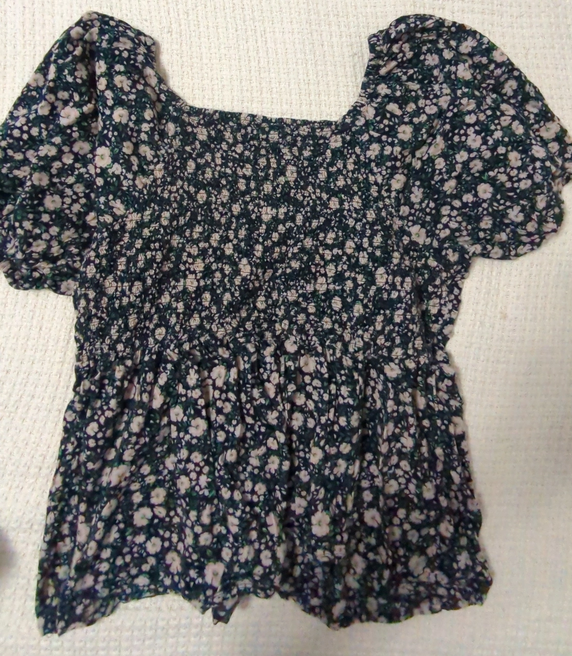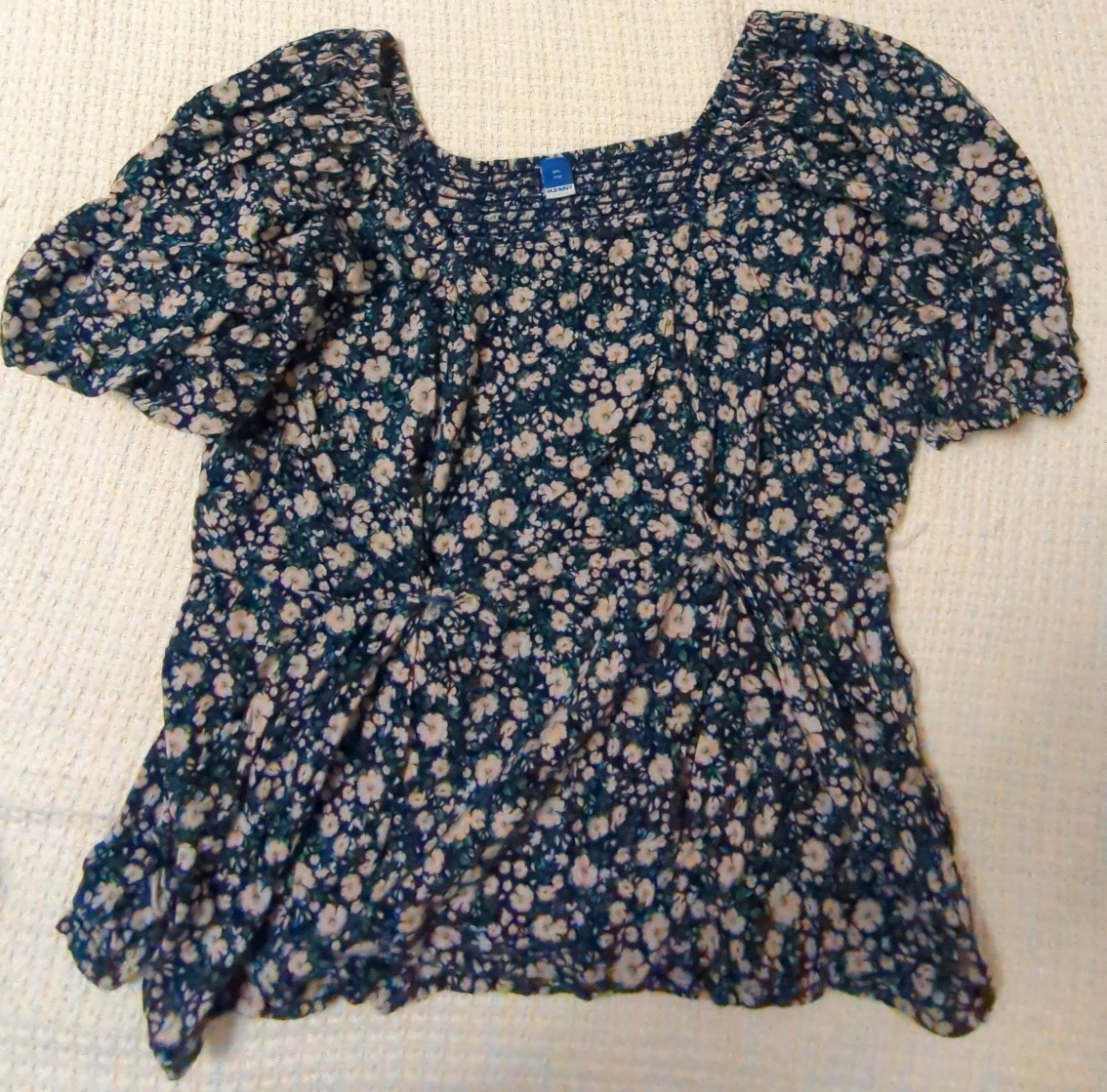 Floral print smocked top. Original Size XXL turned into L. Short sleeves. Square neckline. Pick up options: - Jane and Eglinton or - Dovercourt and Dundas West (Monday to Friday 8am to 1pm)