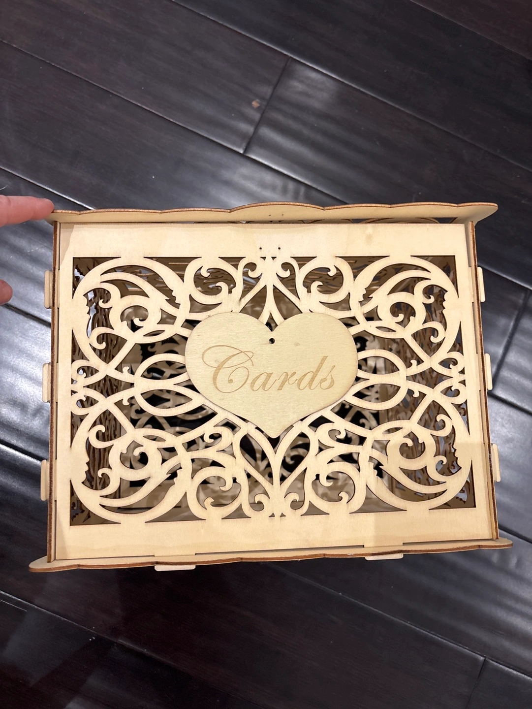 Beautiful laser-cut wooden card holder. Intricate design. Perfect for weddings or other special events. Features a slot for cards and a heart-shaped engraving that reads "Cards".