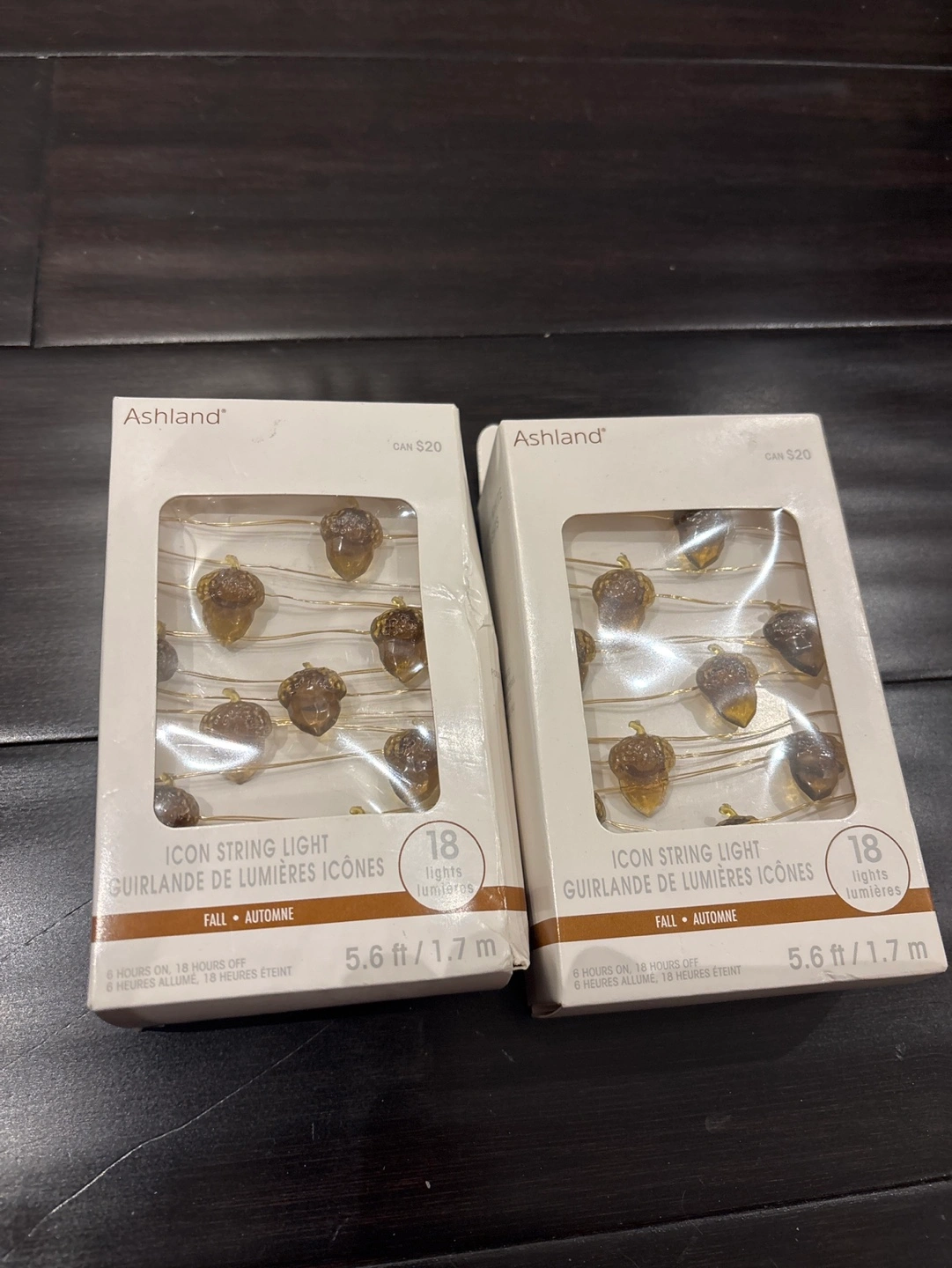 Two packs of Ashland brand acorn string lights. Each pack contains 18 lights and measures 5.6 ft / 1.7 m. Fall theme. 6 hours on, 18 hours off timer.